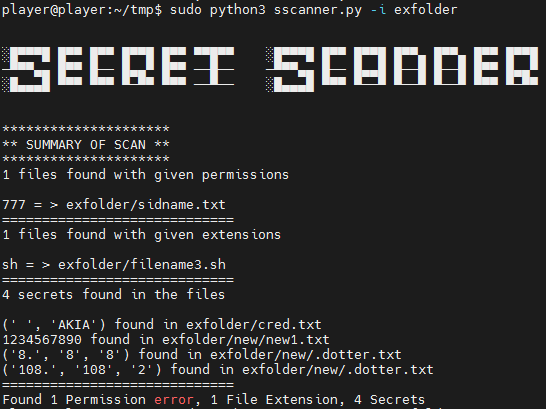 sudo pip3 install .It can be used a cli tool to scan for folder permissions and files secrets. Both folder name and repo url can be passed as argument for scanning. It has two mode normal and quiet mode. ⇒ Normal mode (default) displays a scan summary which includes all the details of scan ⇒ Quiet mode only displays the scan summary