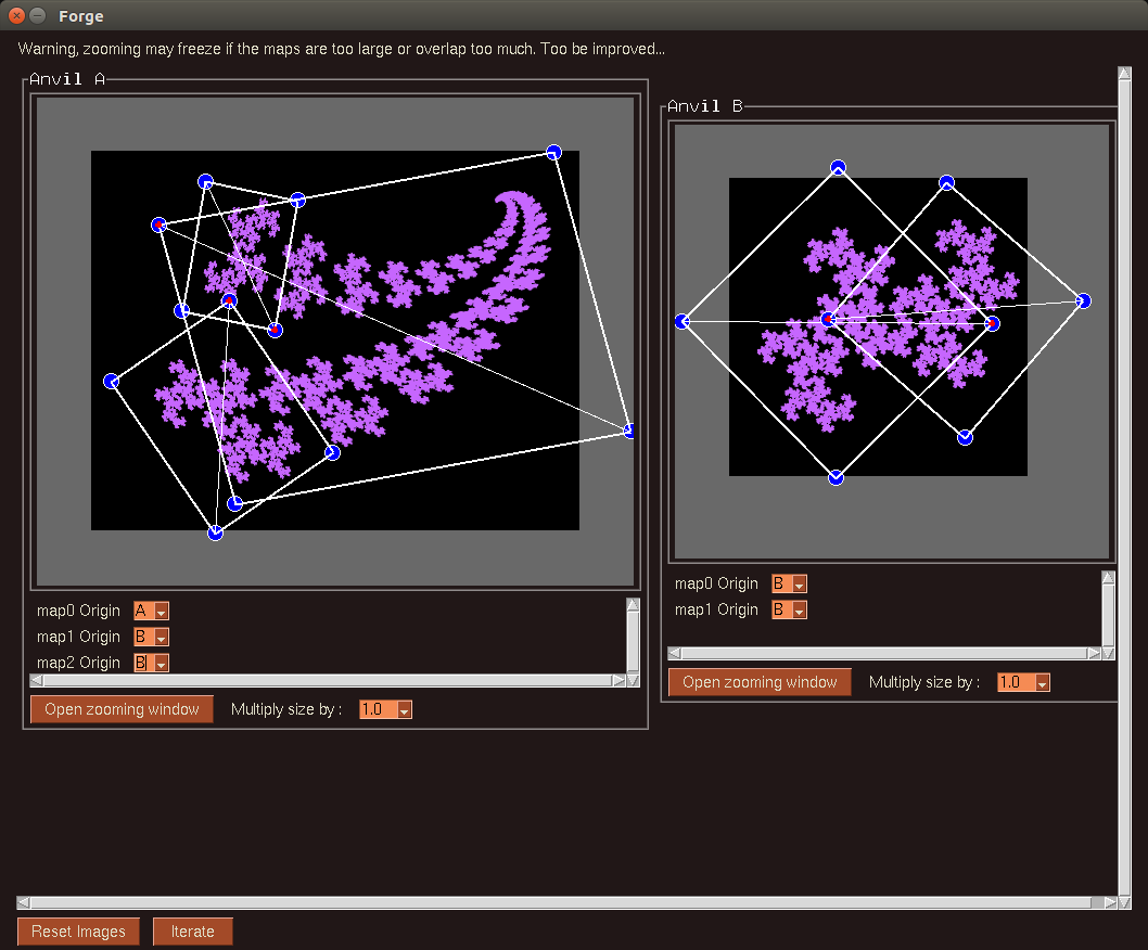 The infinite zoom uses the polysimilarity to construct arbitrarily precise images. When you zoom in, regular bumps happen when the next image is computed. You'll see that the zoom is not consistent if your fractal was touching the border of the image in the editor. This is very normal : the fractal is not a real polysimilar IFS if some part of the image is cut by the boundary. If you draged some of the lateral points of the boxes, you introduced some distortion : the function corresponding to the box is no more a similarity. At some point of the zoom, the image may become blurry. Another issue: if too many branches of the fractal overlap in your window, the zooming will become very slow. Finally, if one of the boxes in the forge is bigger than the image, the zooming code will fail to increase precision by decomposing the fractal in sub-parts, and the programm will crash by stack overflow. The smaller your boxes, the faster the zooming.