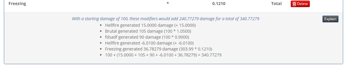 If you would like to know exactly the damage total is determined, you can click on the little "Explain" button to the right of the damage example. It will show what damage each modifier generated and how it affected the total. Please bear in mind the Notes above about the order in which the modifiers are performed.