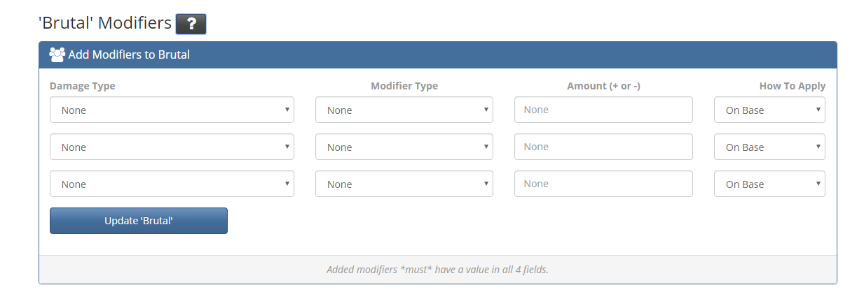 ✋ Note All of the fields are mandatory except for notes. You will notice an "+ Add Damage Modifiers" button. By default, those are all hidden since they are completely optional and take up some real estate. If you wish to add a modifier while creating, click that button to get access to them.