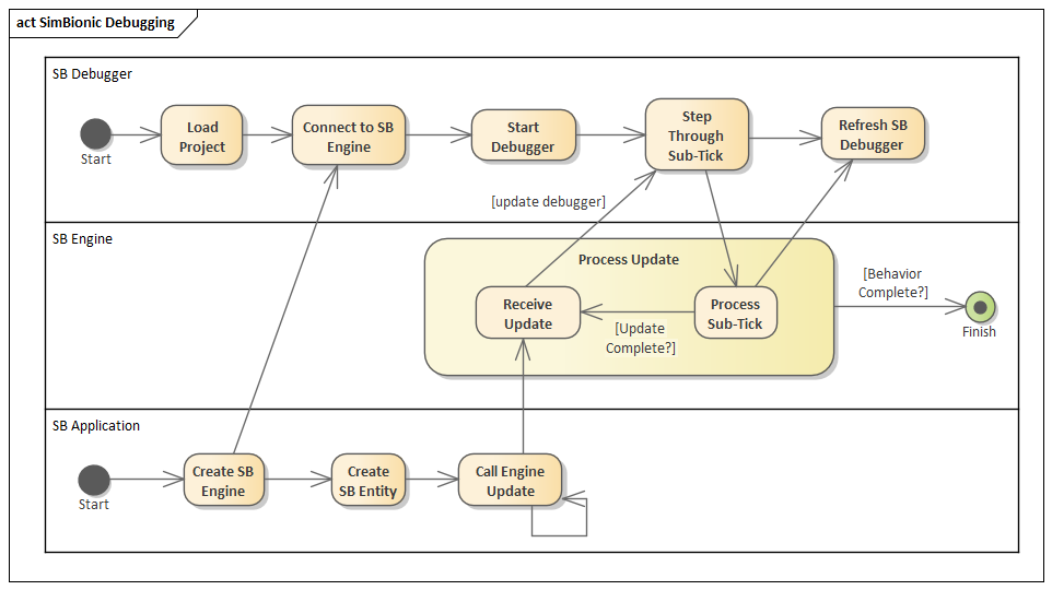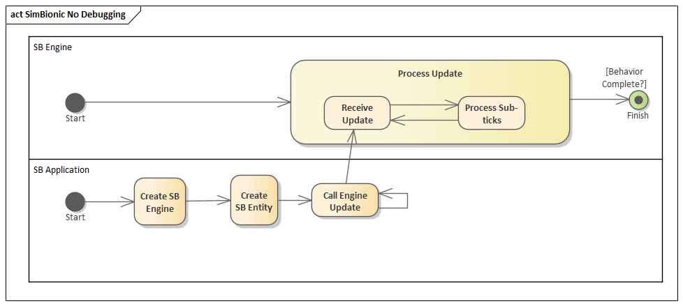 a) Where it says [Behavior Complete?] is incorrect. Re-label that [Update Complete]. E.g., if yo have a one-tick behavior and it calls another one-tick behavior then the call to update is complete after both of those behaviors are complete.