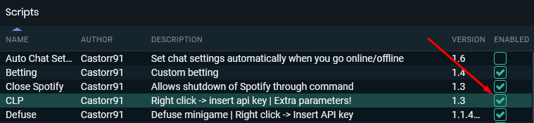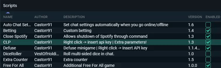 In Streamlabs Chatbot head over to the Scripts tab and locate the script you are setting up the overlay for. Right click said script and press insert API key, in the image below I decided to insert the API key for the CLP script.