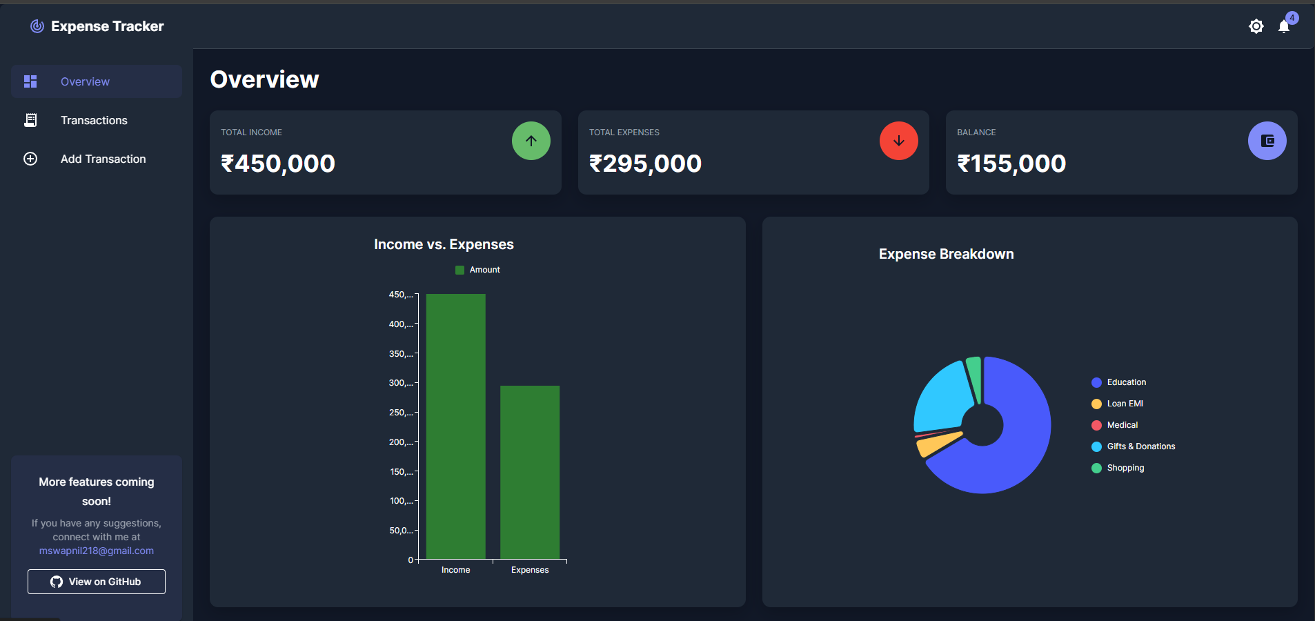 - Visual charts: Pie and bar charts to visualize income vs. expenses.