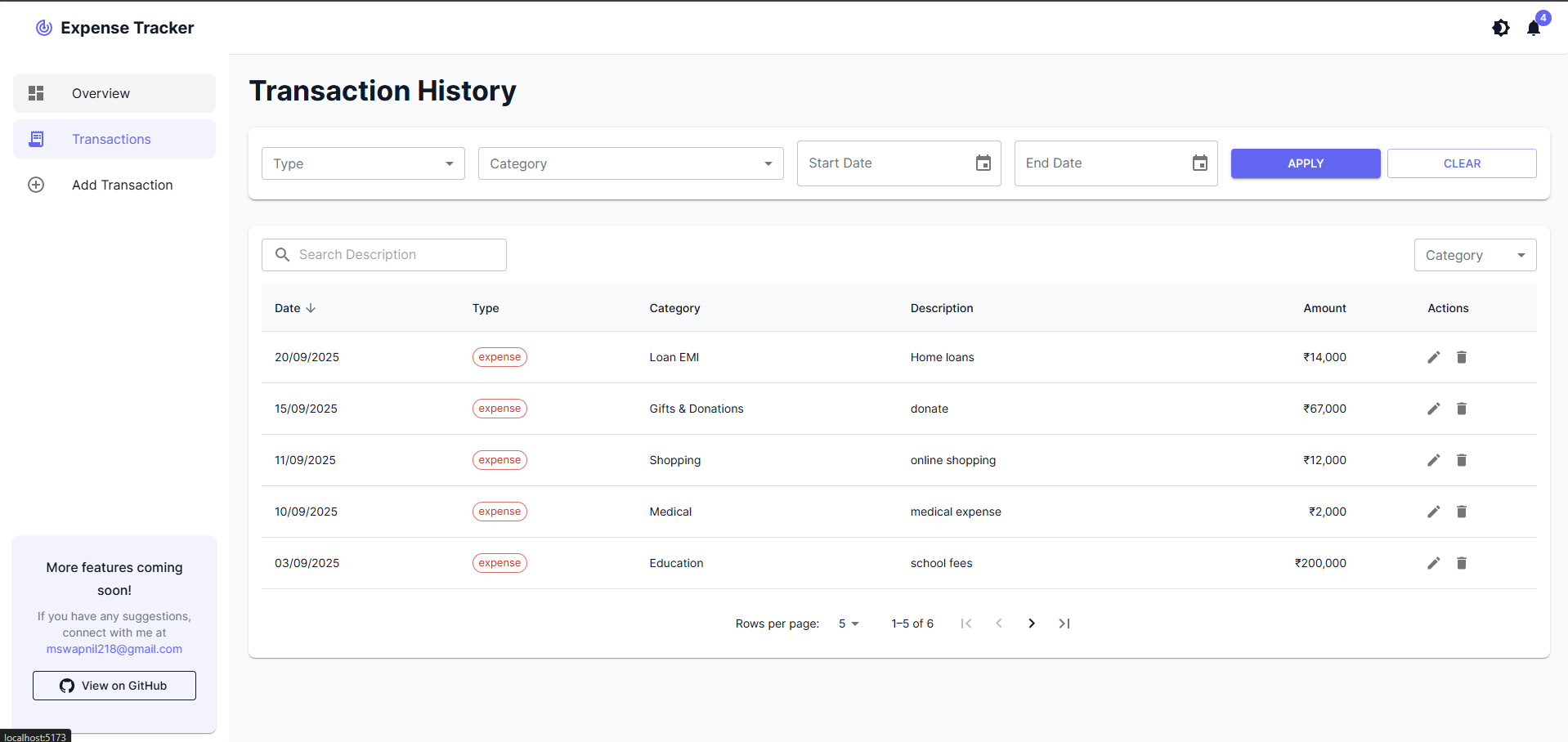 - Filter transactions: Filter by type (income/expense), category, and date.