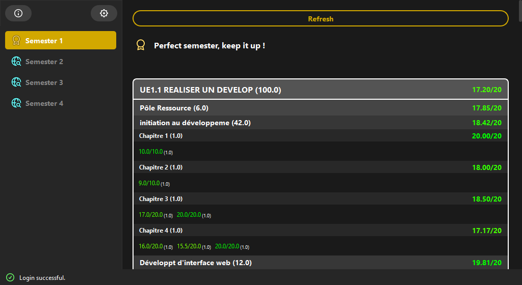 On top of the UE list, you can see a refresh button and an encouragement message with the UEs to focus on if you want to improve your average grades (when you don't have the perfect grade).