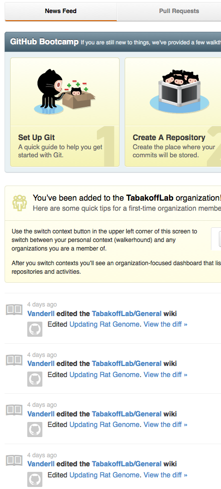 When you go to main github page and log in you will see a news feed where you can read about changes to repositories and wikis that you are watching.
