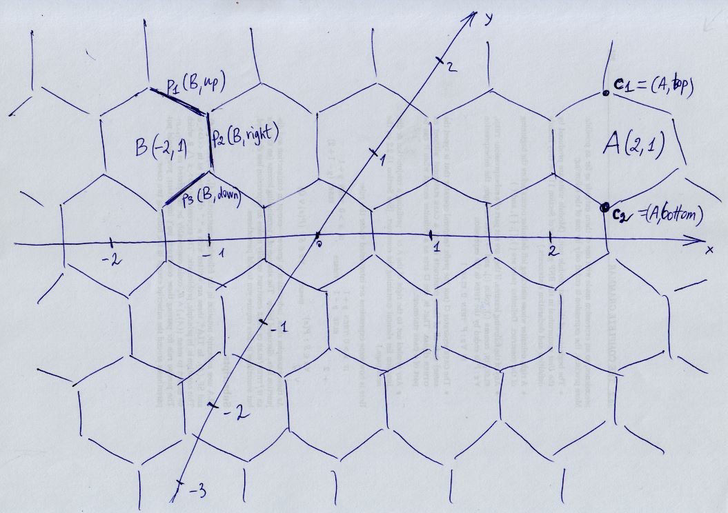 гекса А помещен в точку (2, 1), потому что до гекса можно добраться, совершив из центра координат