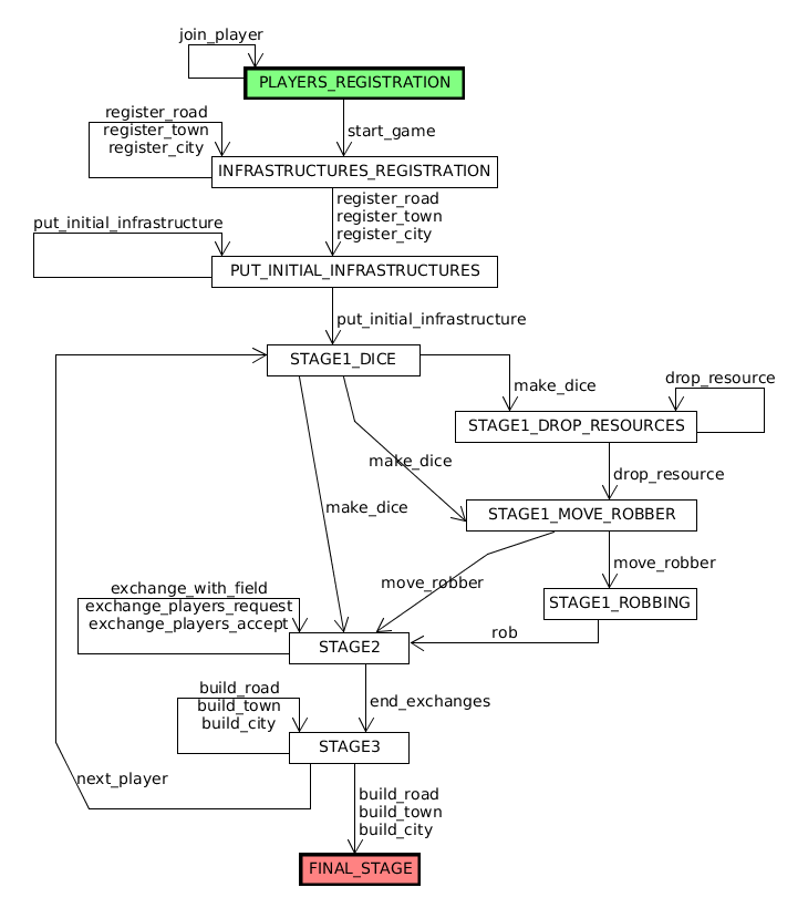 - Каждый игрок выбирает имя и получает 5 поселений, 4 города и 15 дорог. Каждый игрок ставит на игровое поле по 1 поселению и по 1 дороге в прямом порядке игроков, затем - еще по 1 поселению и 1 дороге в обратном порядке. Лишние поселения, дороги и города игрок кладёт перед собой.