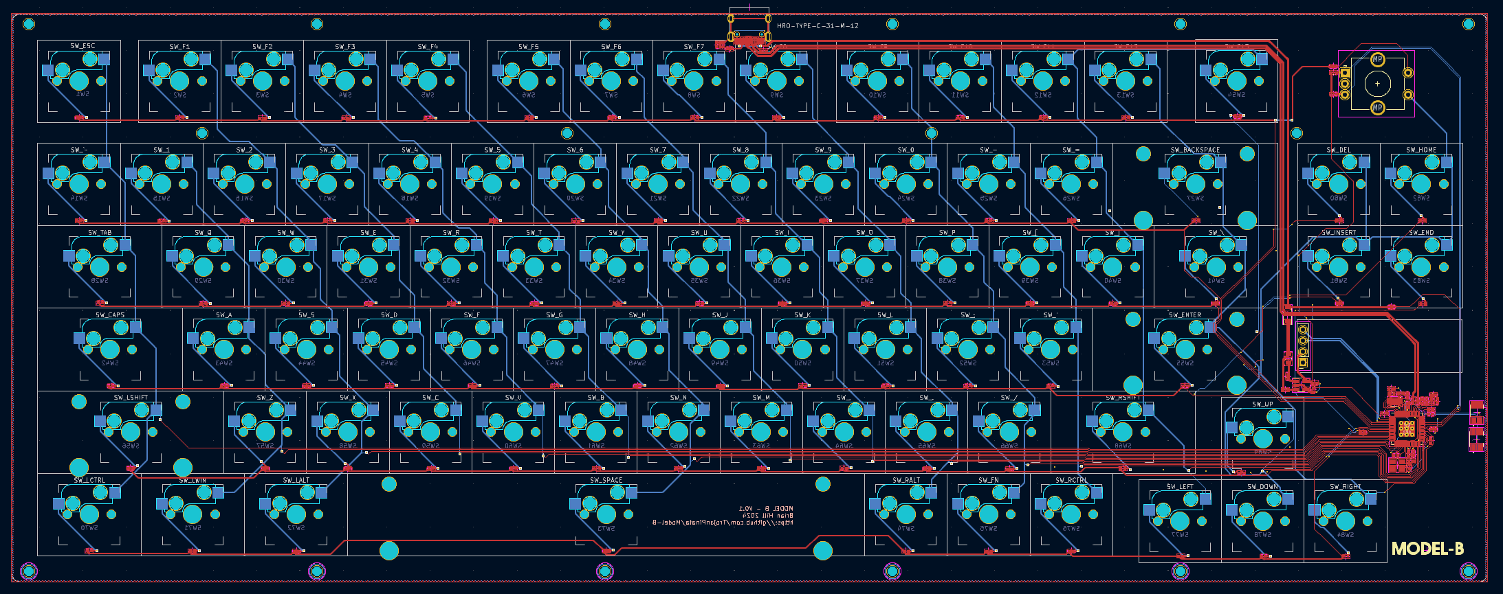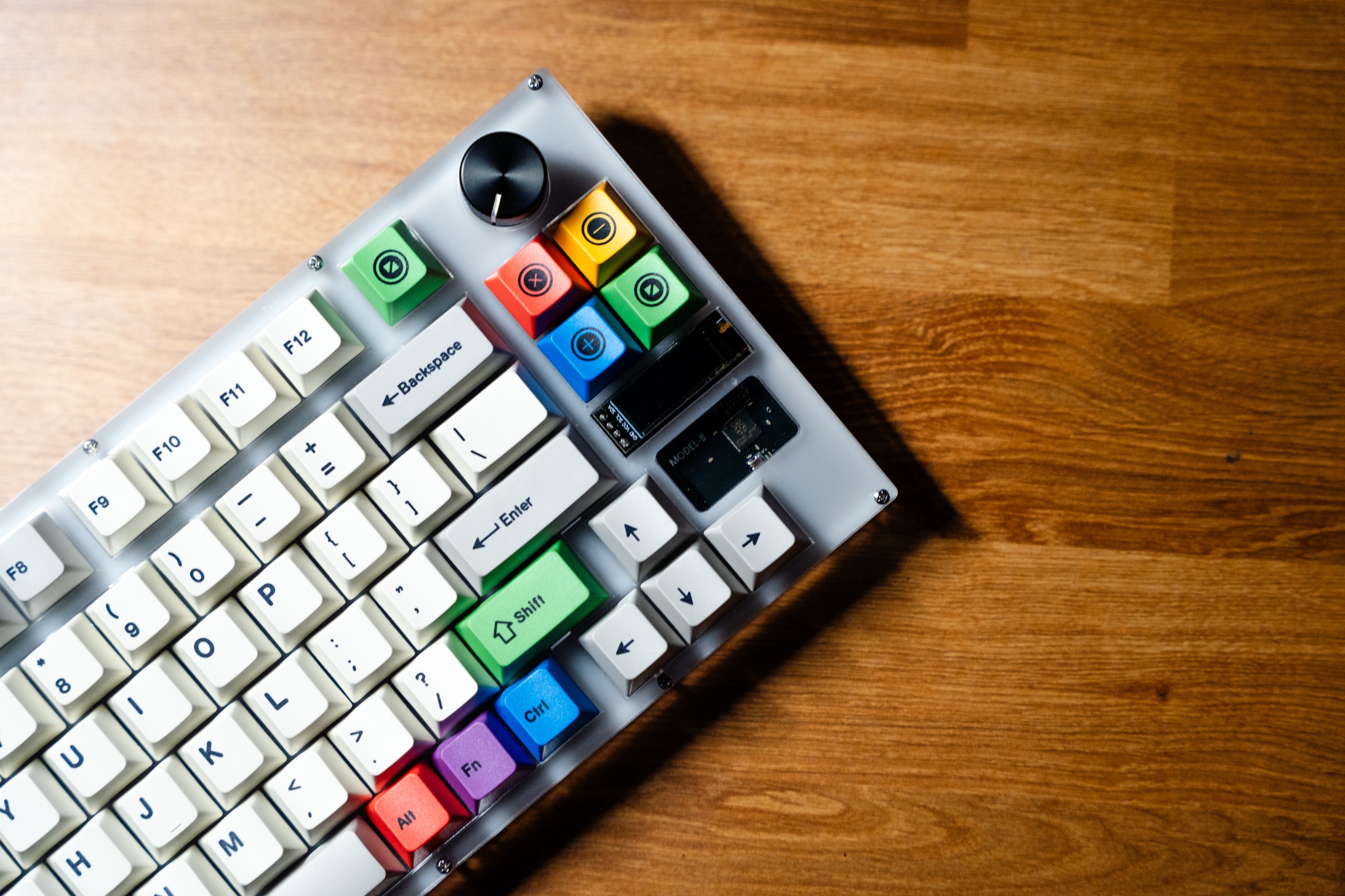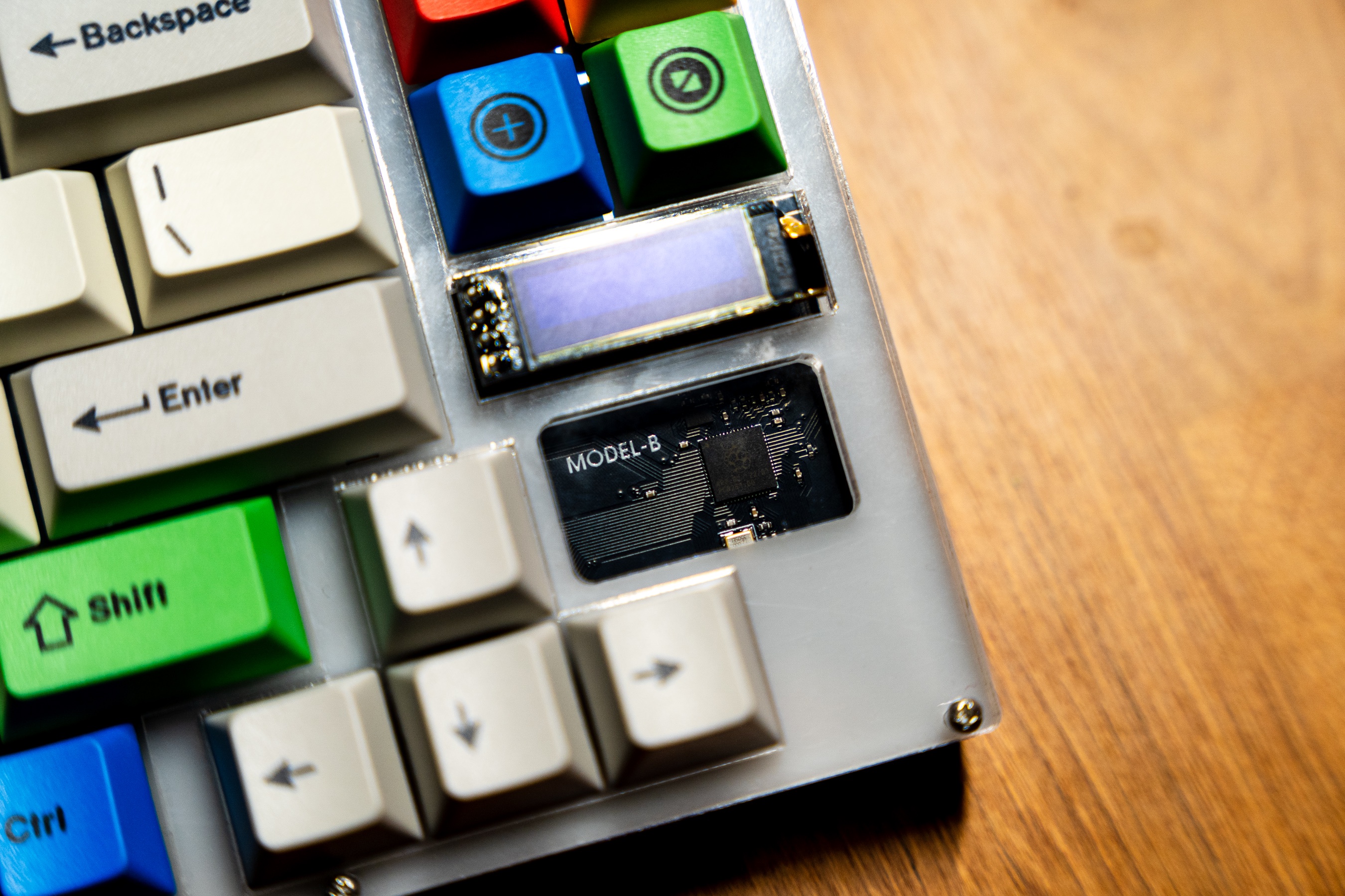 The Model-B is the second keyboard I've developed and aims to be the direct successor to the Model-K. I made this with the intention to develop a hotswappable keyboard which uses SMD components in order to reduce soldering overhead and learn microcontroller hardware development. The case is clear acrylic with a delrin switchplate and holds a eleven degree angle, and is reasonably heavy - a much more complete feel compared to the Model-K.