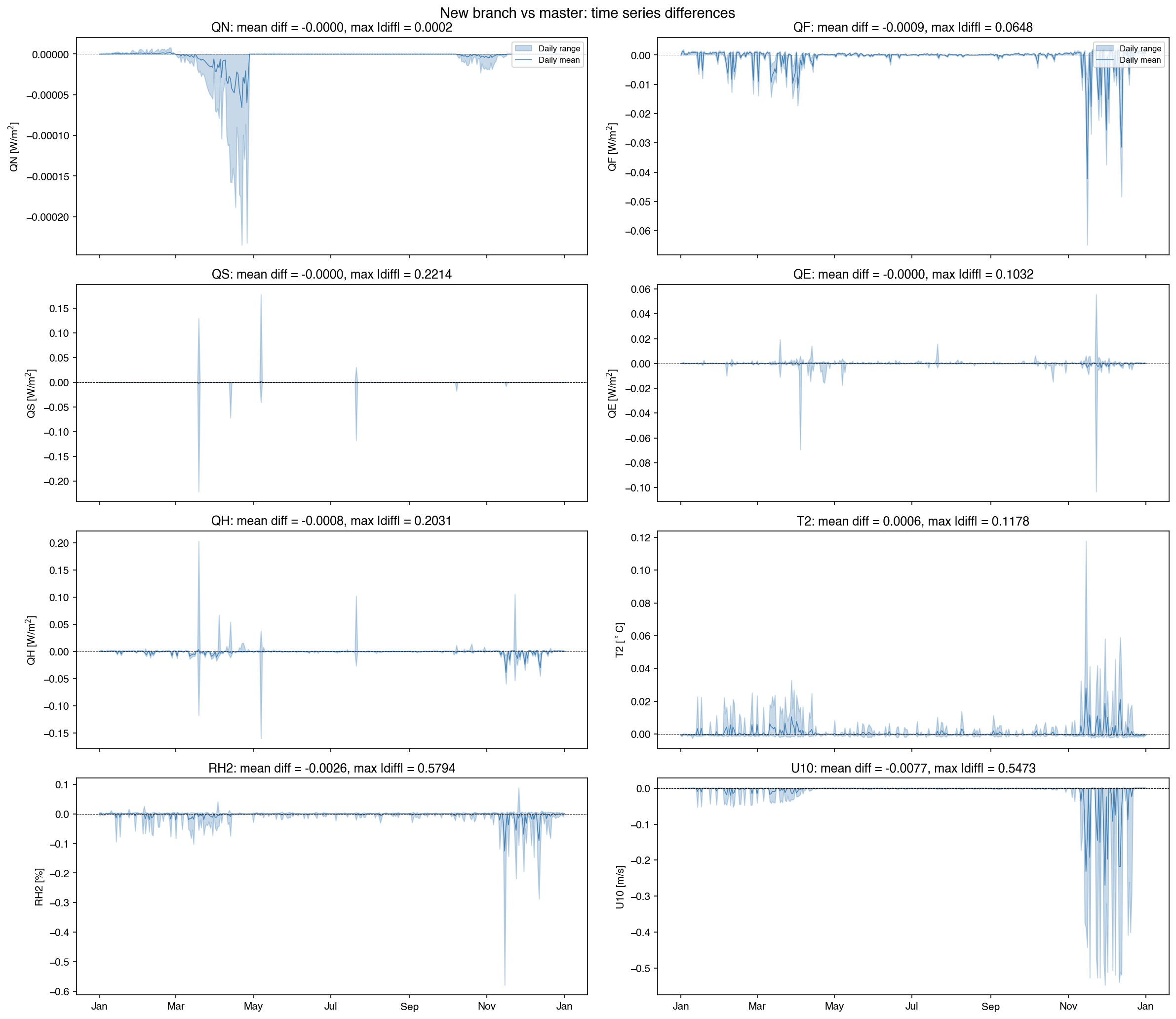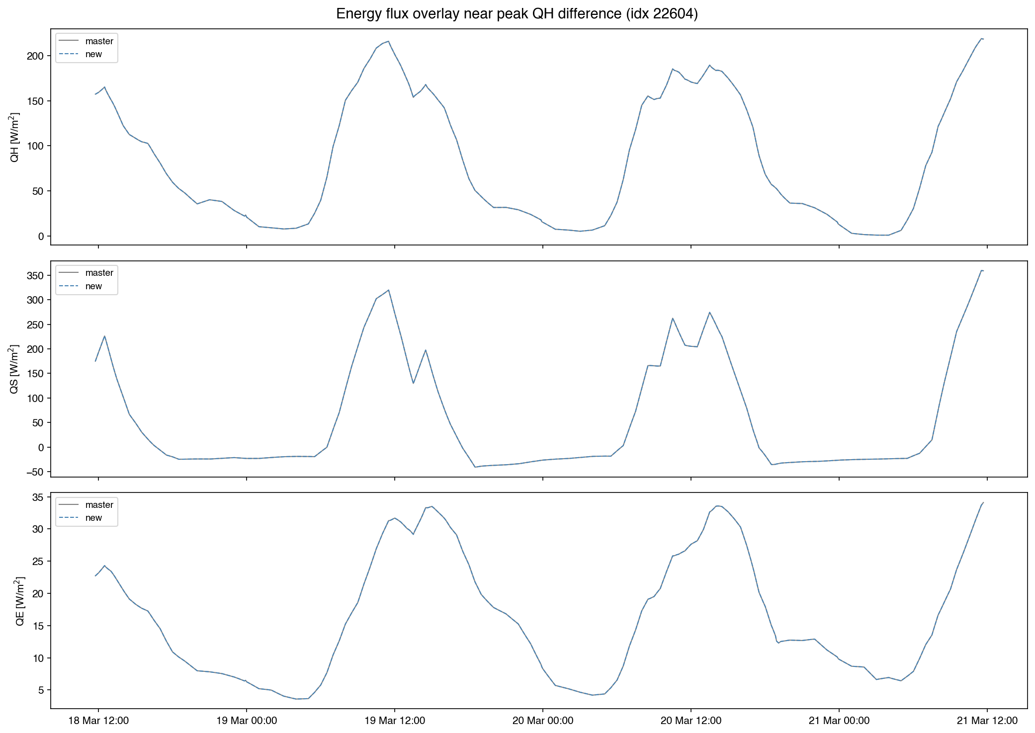 Time series differencesScatter comparison (new vs master)Flux overlay near peak QH difference |