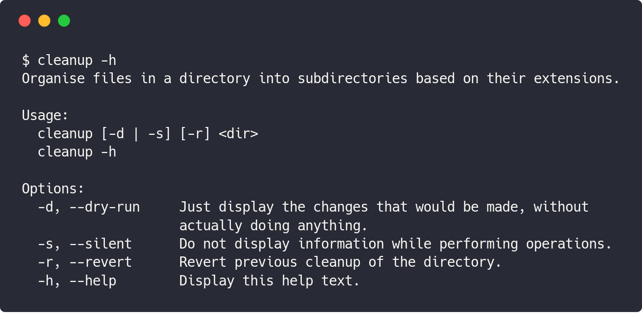 When run without any option, it organises the files in the specified directory into subdirectories based on the files' extensions.