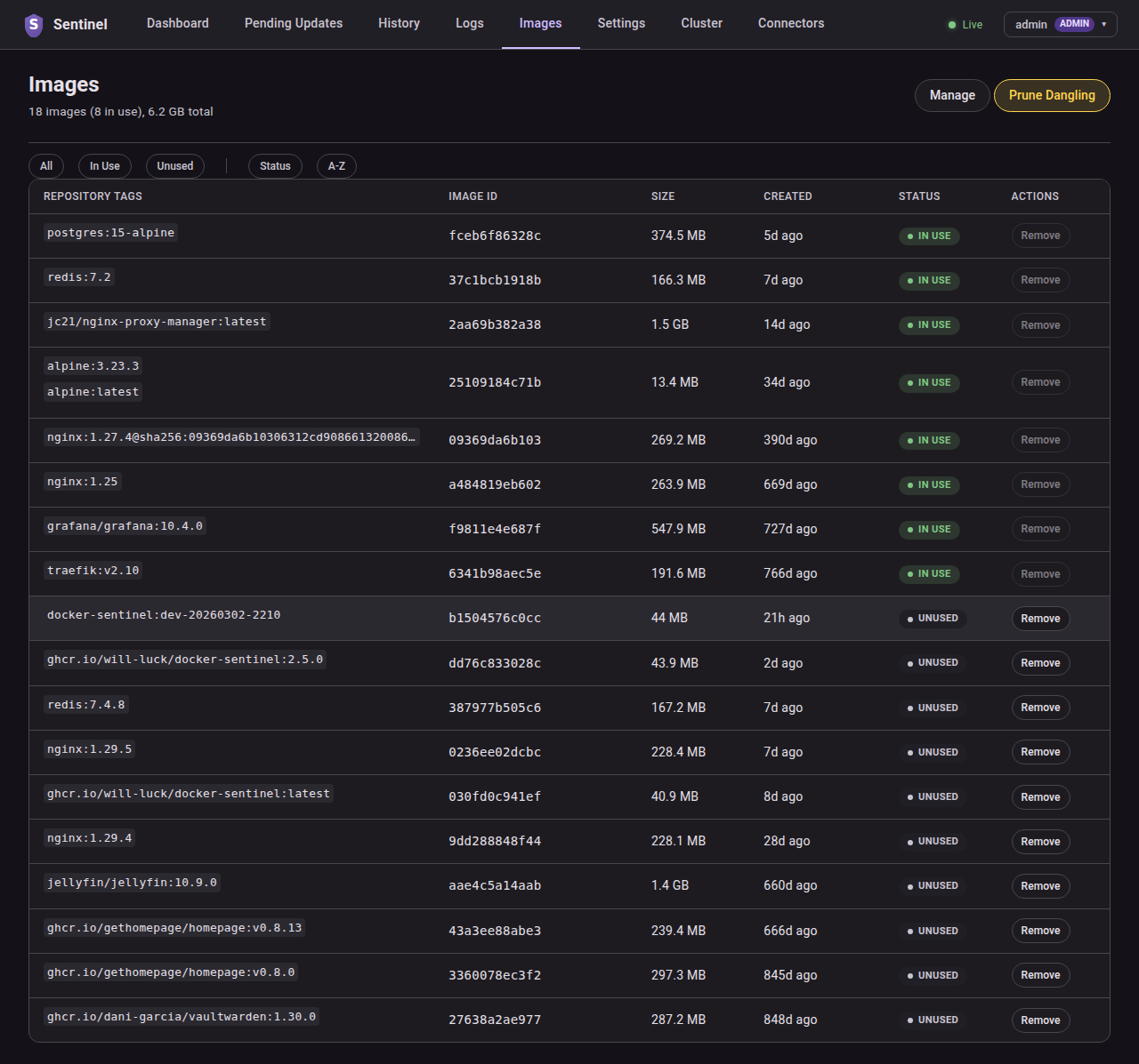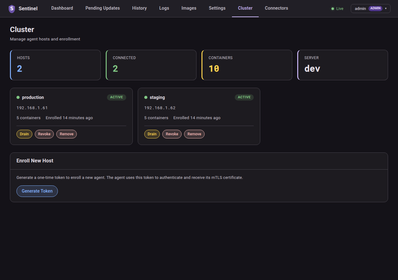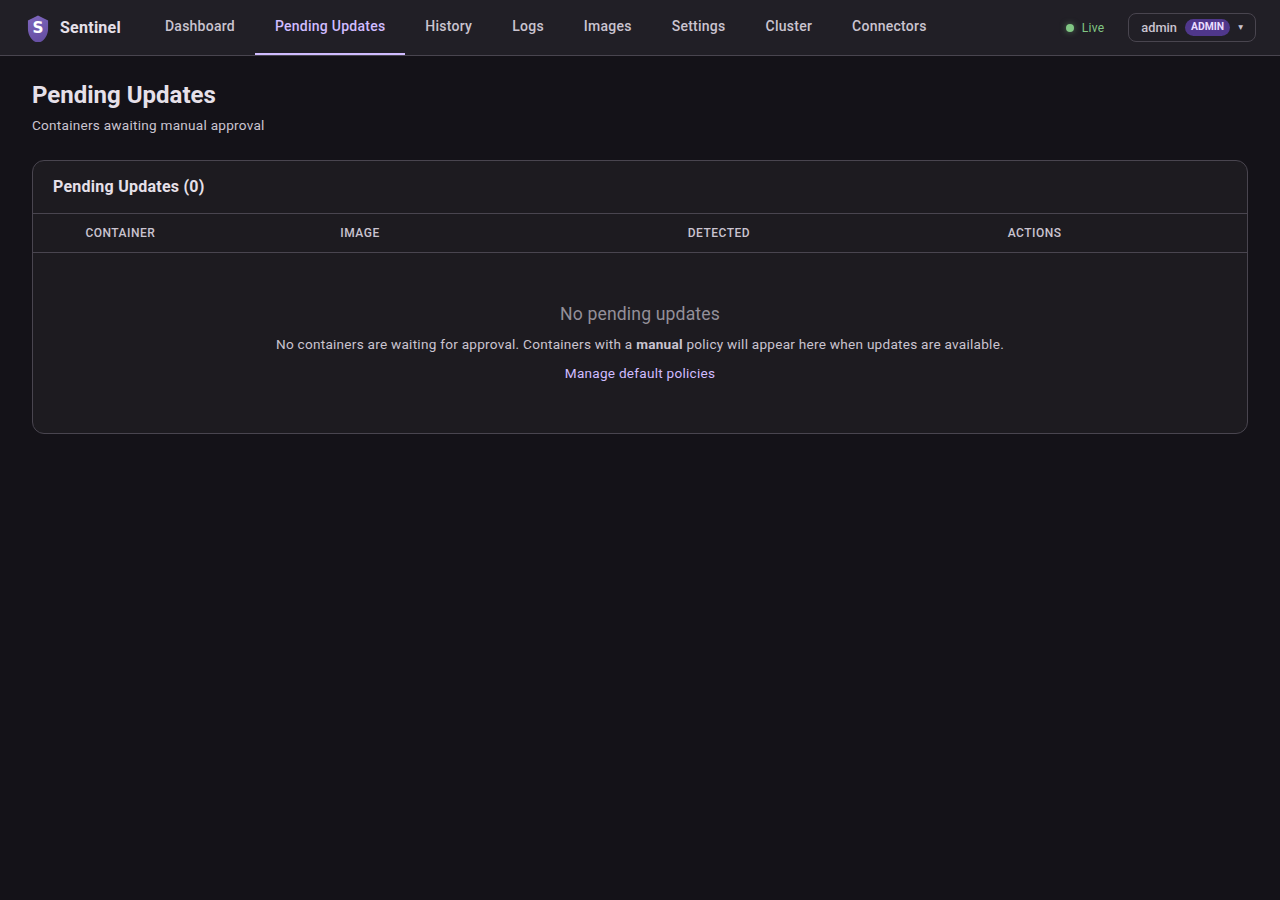 # ghcr.io/will-luck/docker-sentinel:latestOpen http://localhost:8080 in your browser. On first visit you will be guided through the setup wizard to create an admin account.