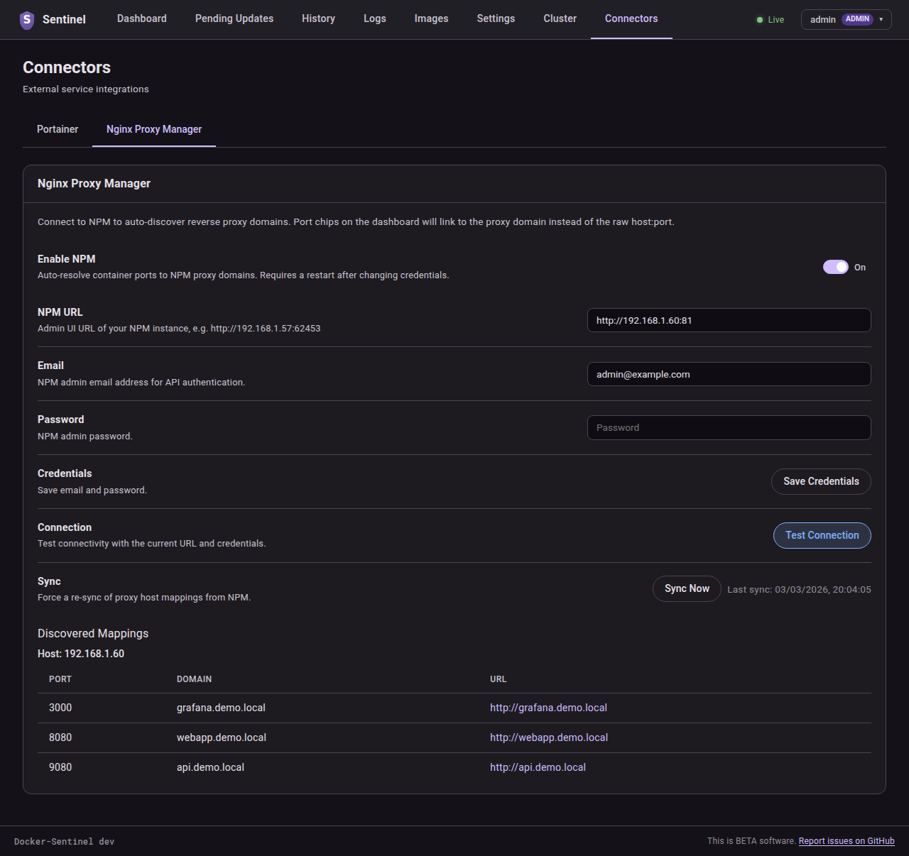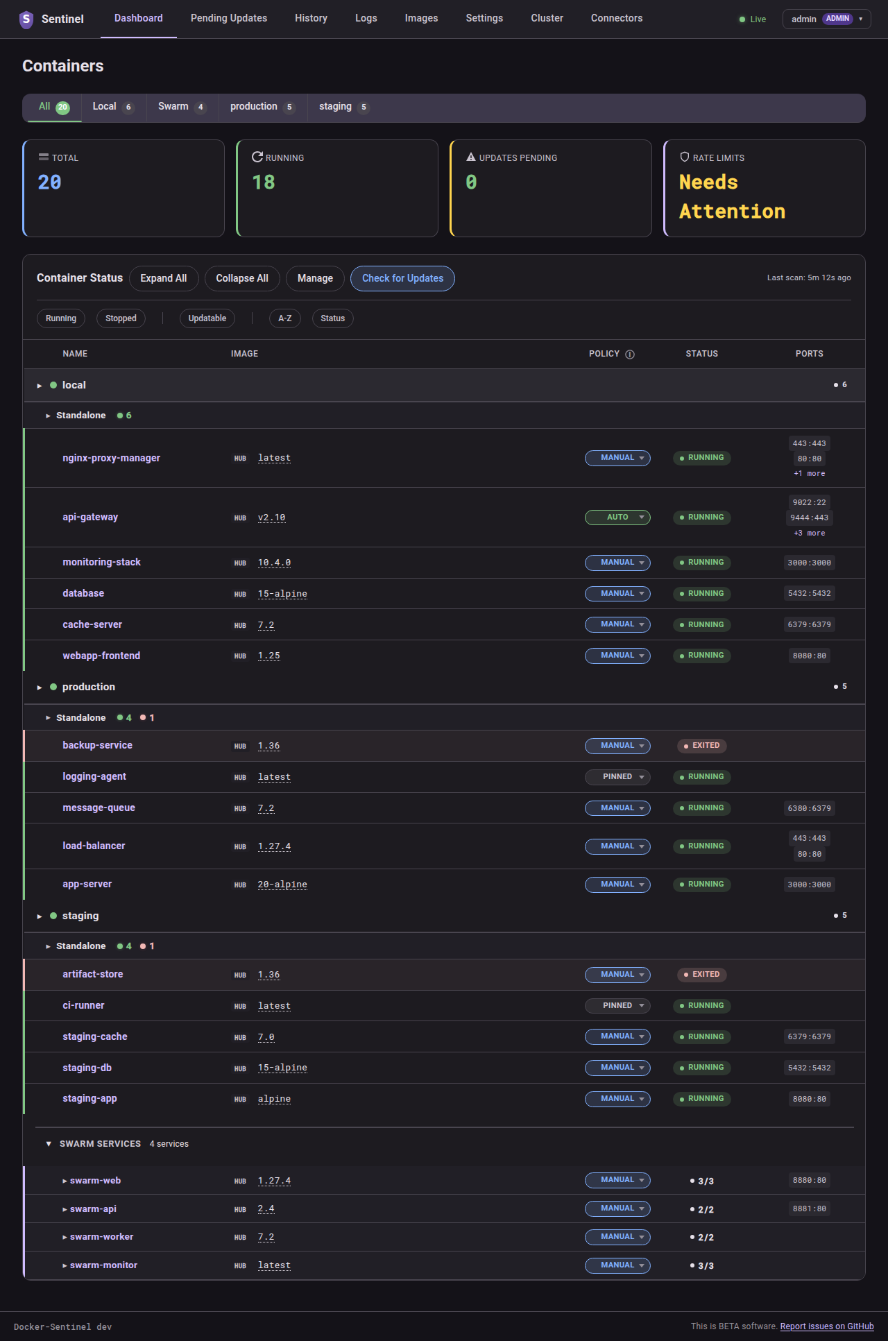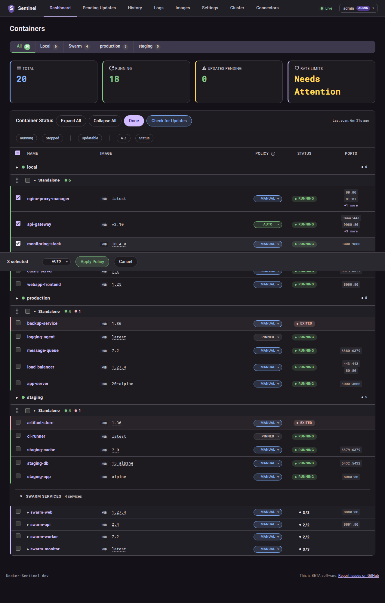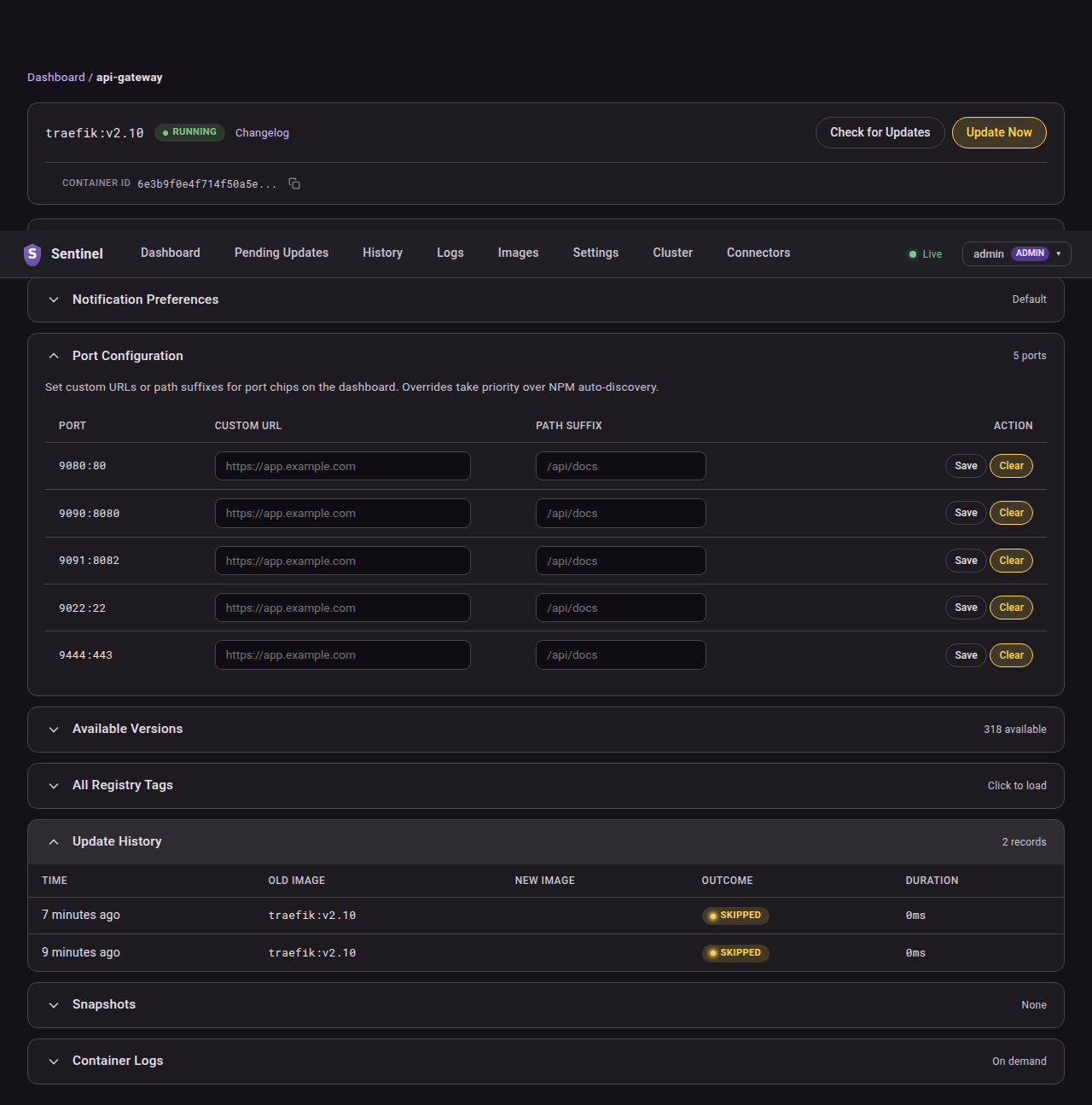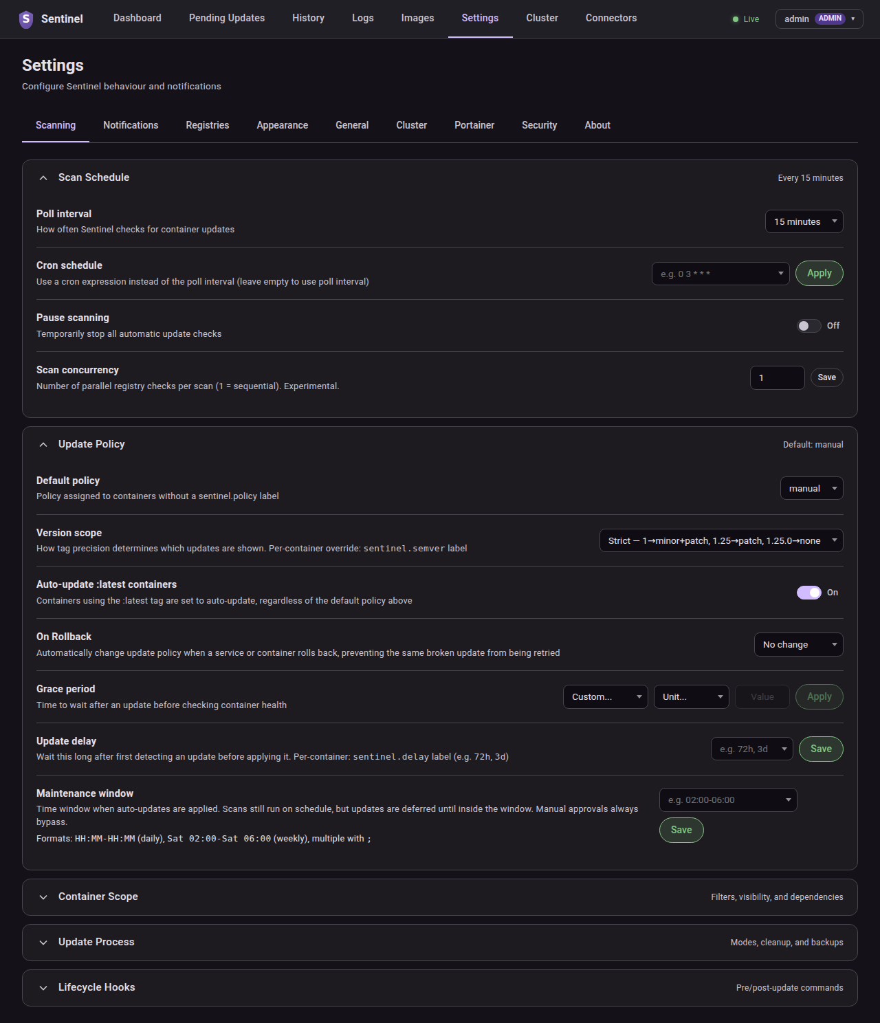Set per-container update behaviour with Docker labels like sentinel.policy, sentinel.semver-constraint, sentinel.cron, and others. See the Docker Labels wiki page for the full reference.
