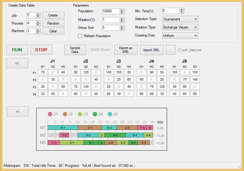 The application contains a matrix data table that enables users to enter specific datas which refers to completion time of processes to create the problem. After the "RUN" button is clicked, the program starts scanning the solutions and drawing it into the chart area. It is so simple and clear to use.
