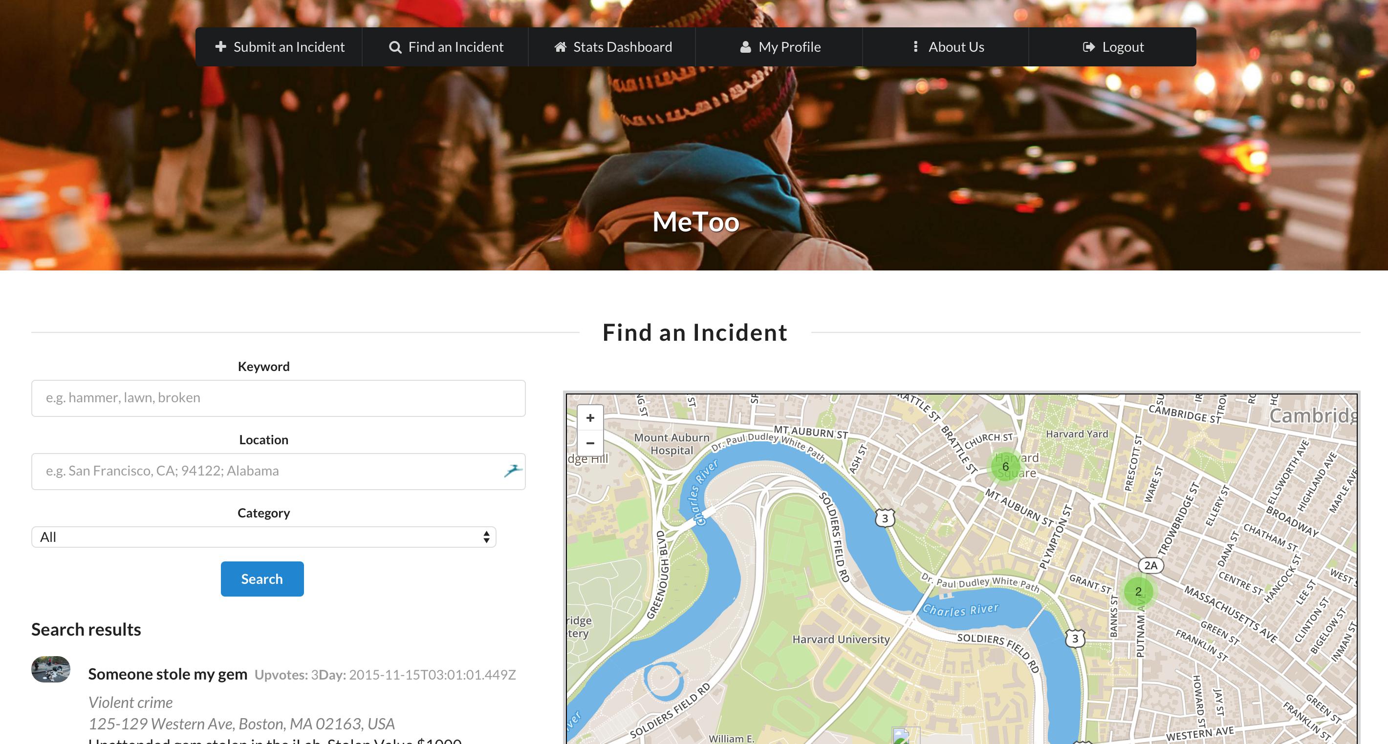 We wanted to turn the tables and put information back in the hands of Harvard students. MeToo is an app that allows people to anonymously post information about assaults on a map and other students can search the information so they can make the best informed decisions as they go about their daily lives.