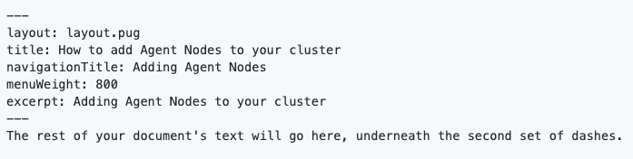 Every index.md file must have the minimum front matter metadata of: layout, title, navigationTitle, menuWeight and excerpt.