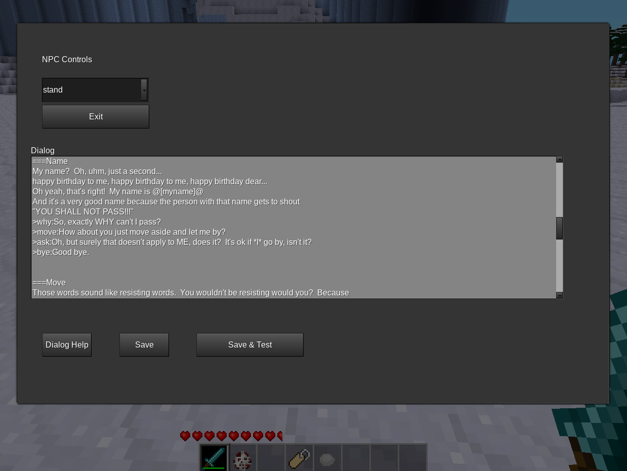 So, I decided to take a break and log on to a multi-player minetest server and just PLAY for a while. I had been on the "Your Land" server in the past, but only briefly. This time I spent a bit more time exploring and discovered that they already had npc's with dialogs! Theirs, I believe, operate via a lua api, so I think they are very different from this code. But one thing I really noticed was their gui. They were using a transparent background for the formspec so that they could have the npc dialog part of the formspec off to one side, and the replies down below. I didn't even know that was POSSIBLE. So, I went back to work on my mod, figured out (with some help on the forum) how to do a formspec with a transparent background, and thus you get the formspec in it's current form. I've never seen the code for the npcs that is used on Your Land, and I don't even know who the coder is that I should credit, but I definitly borrowed a design element from them, and so, Thank you!