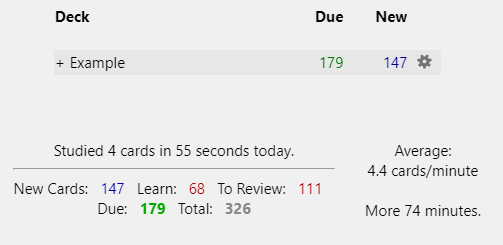 This addon shows extra information of the due cards and returns the expected time to finalize (Due+New).