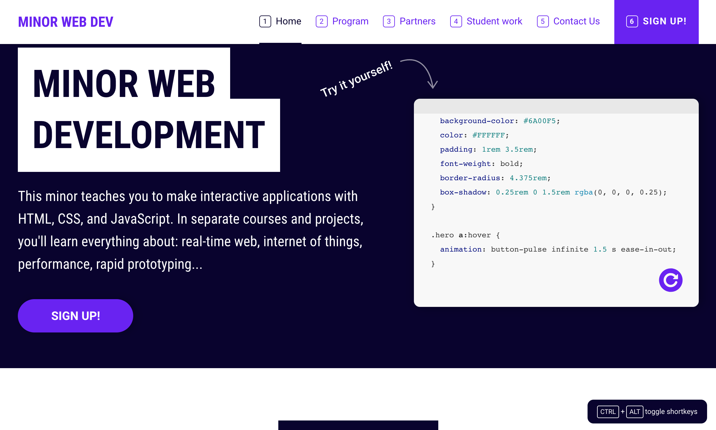 During this project we redesigned the website for the minor 'web development' at the University of Applied sciences in Amsterdam. We have done our best to make a very experimental yet pleasurable web site.