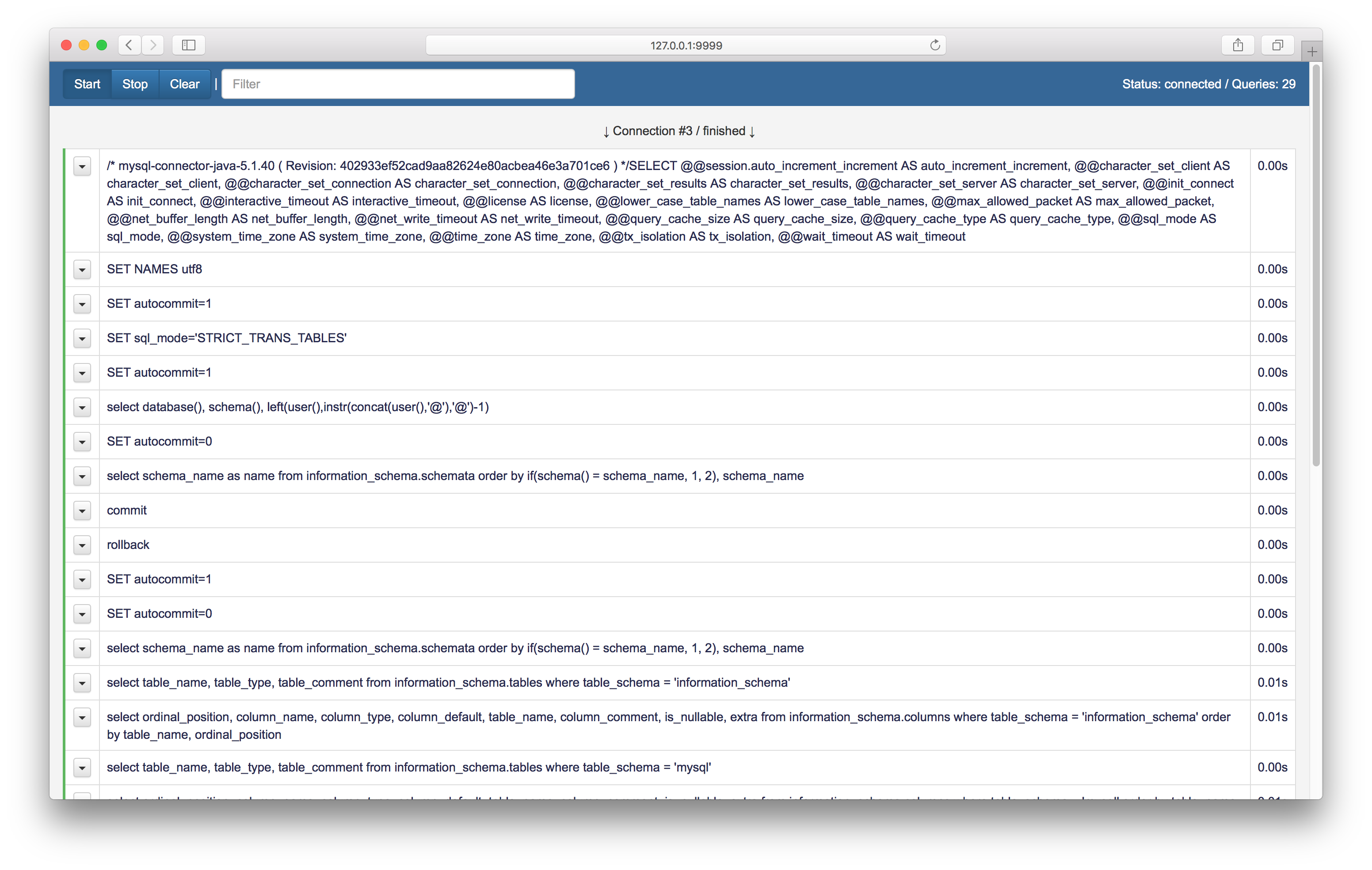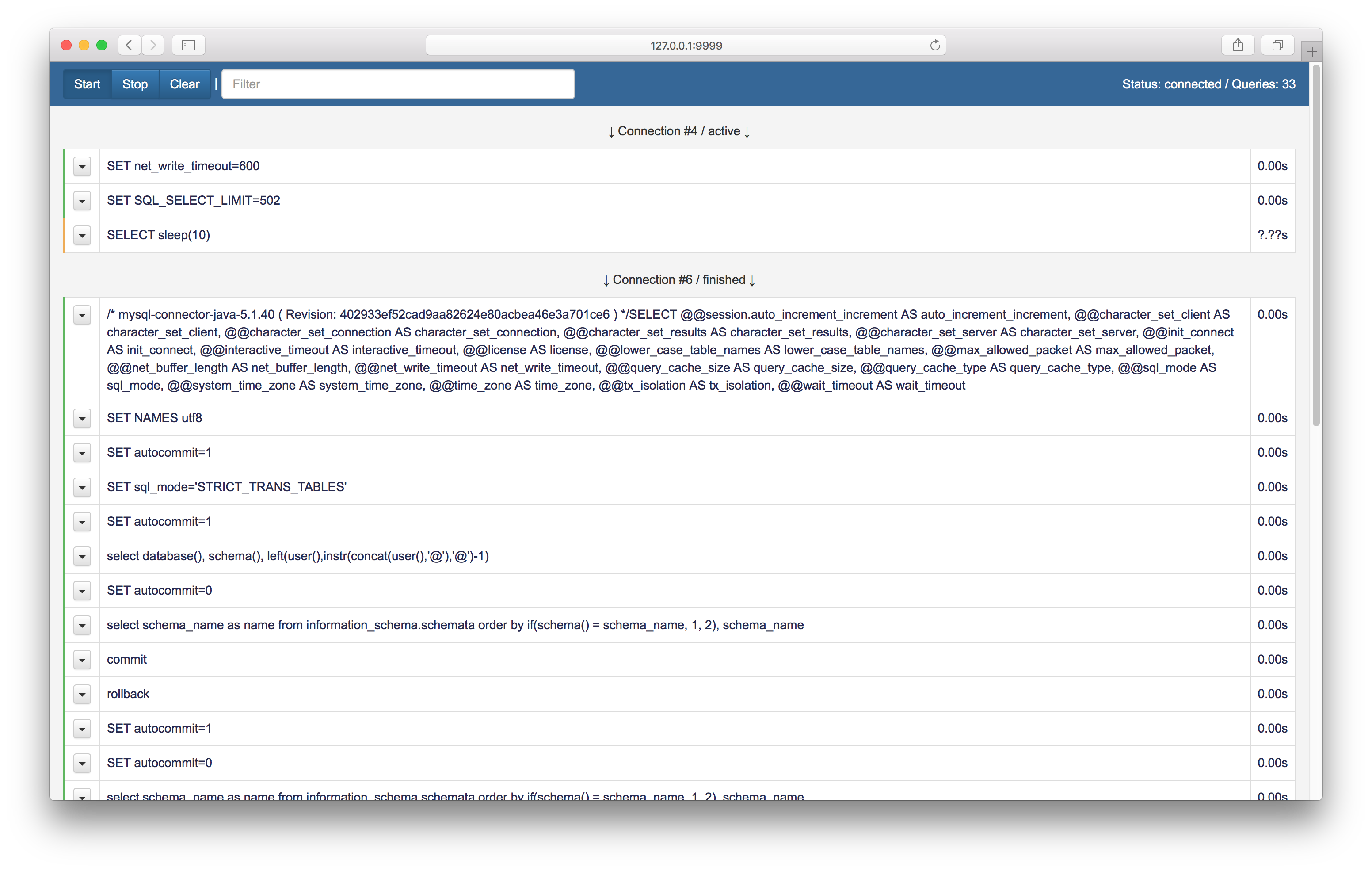 4. Play with your app and see all SQL-queries flowing between your app and MySQL. No need for page refresh because websockets are used to communicate between frontend and backend.