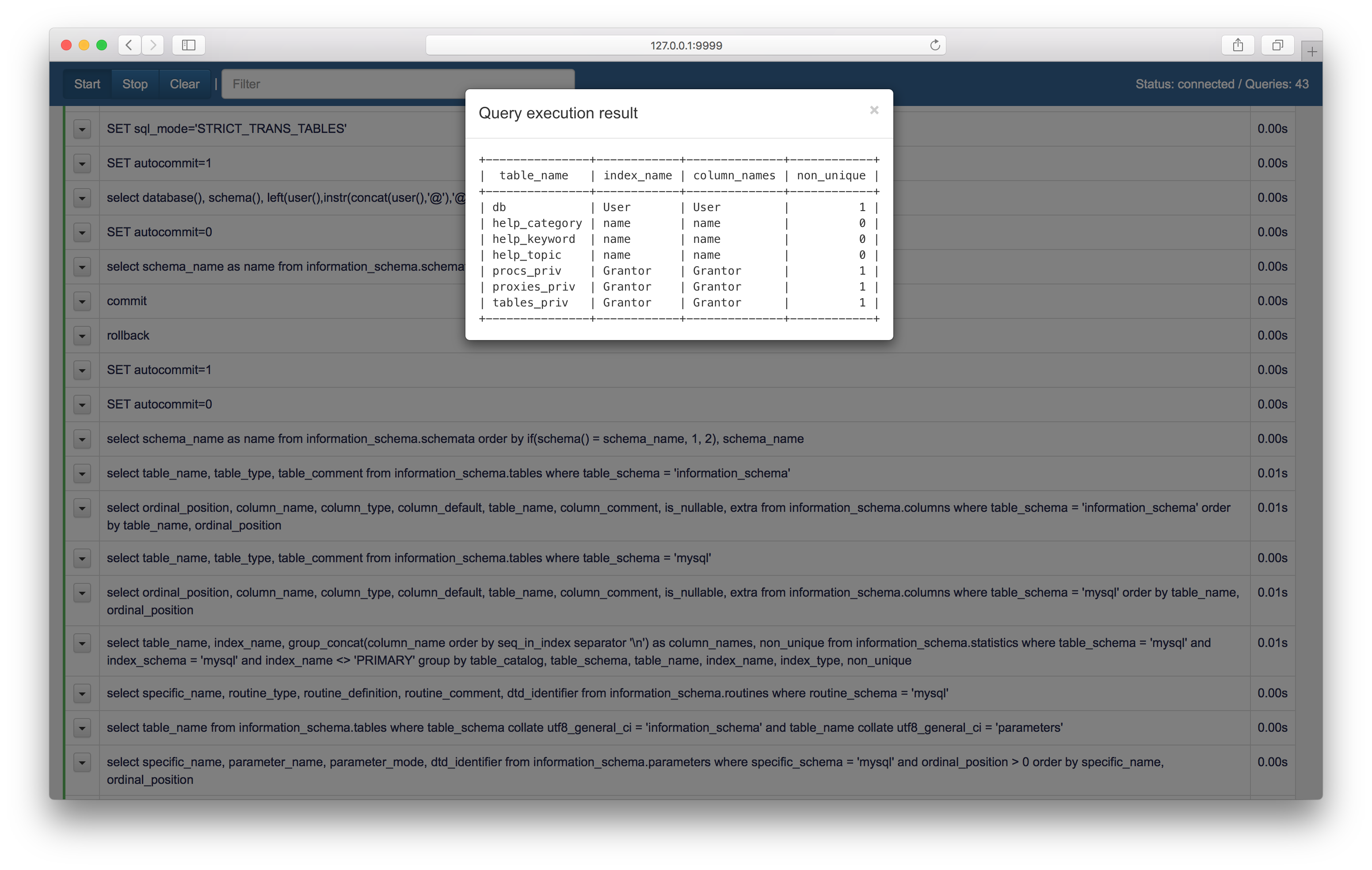 Lottip is proxy for MySQL RDBMS with web GUI. It will show you what's happening under the hood of your database layer. As it sits between your application and MySQL server there's no need to use tools like Wireshark or enable general logs to see which queries are being executed. It comes as single binary with zero dependencies and consists of 2 parts: proxy server and embedded GUI.
