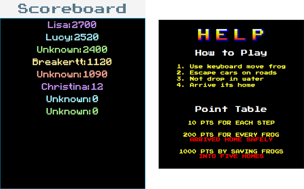 This project stores historical scores in user's home directory: ~/.frogger.
