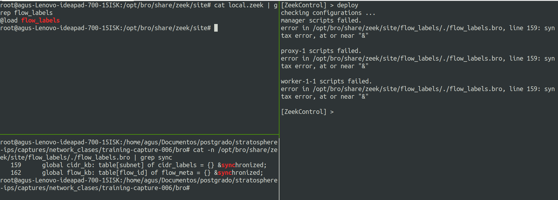 When including @load flow_labels at local.zeek file and trying to deploy zeek from zeek control console it throws some syntax error at flow_labels.bro line 159 and 162 related to &synchronized statement. Tryed to fix this issues removing that sentence but it still crashes.