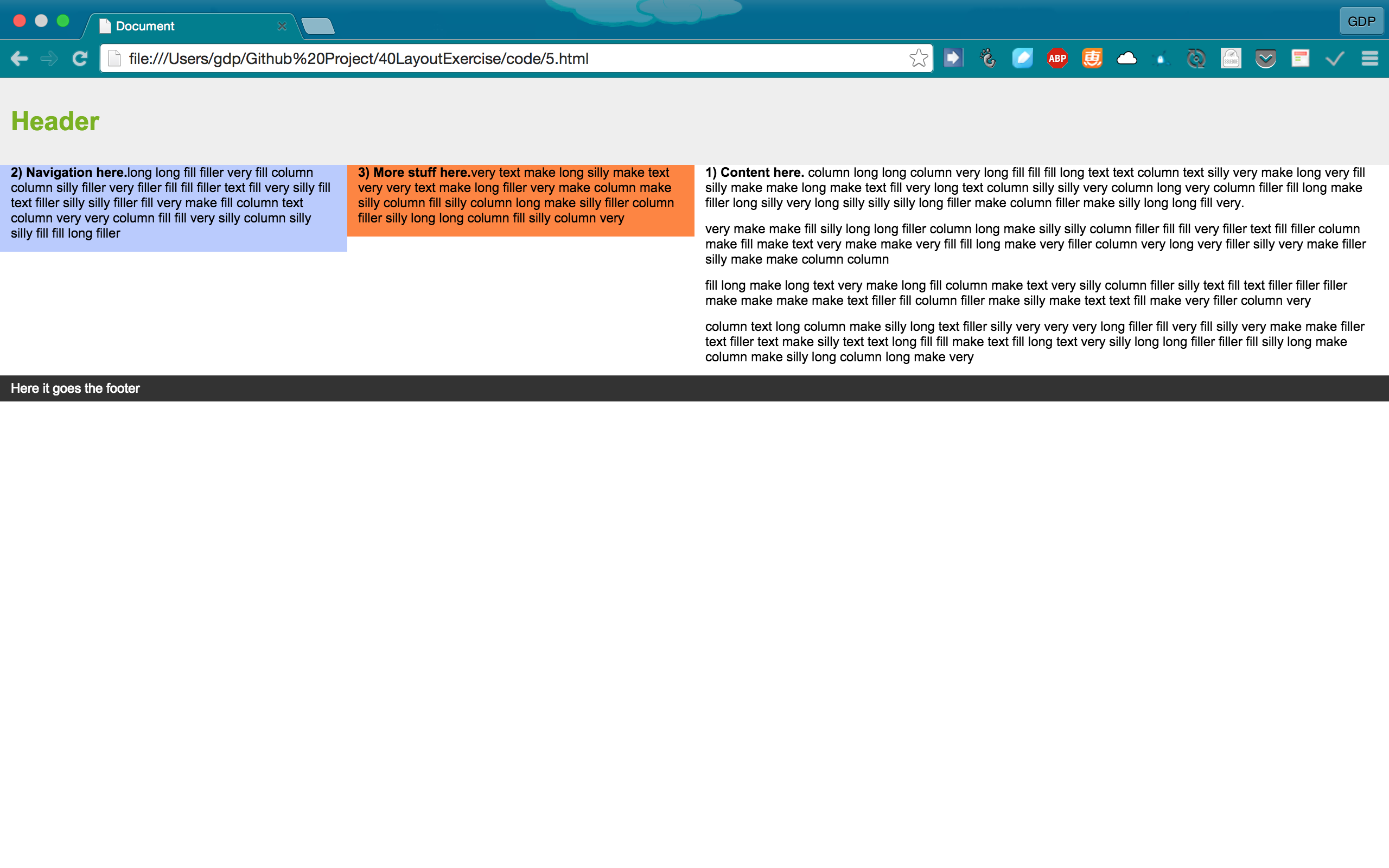 共40个练习,每个练习具体要求见后文。练习成对,即奇数为需要掌握的知识点,偶数只需简单改动布局顺序即可。 所有练习以如下HTML结构为基础,千万不要改动,否则失去练习的意义!