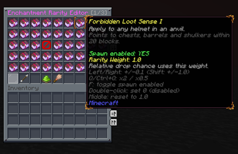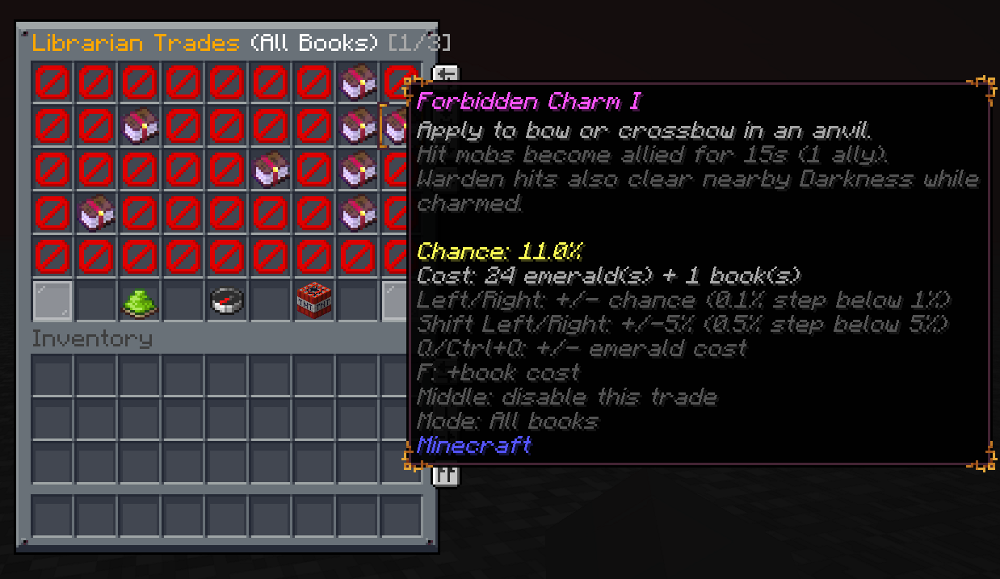 /feadmin command with help/list output and colored feedback. /fe guipaged creative style inventory menu sorted by enchant type, with quick category filters./fe injectorcommand suite for structure/vault injection setup (help,status|list,enable,disable,add,set|chance,remove,clear,defaultchance|default,vault,gui|menu)./fe injector guivisual editor for injector structure lists and per-structure chance tuning./fe librariancommand suite for librarian trade blend setup (help,status|list,enable,disable,add,remove,clear,gui|menu)./fe librarian guivisual editor with all-book + configured views, per-book chance, and cost tuning.- Librarian blend mode keeps vanilla/datapack trade generation and appends configured forbidden-book offers by per-trade chance.