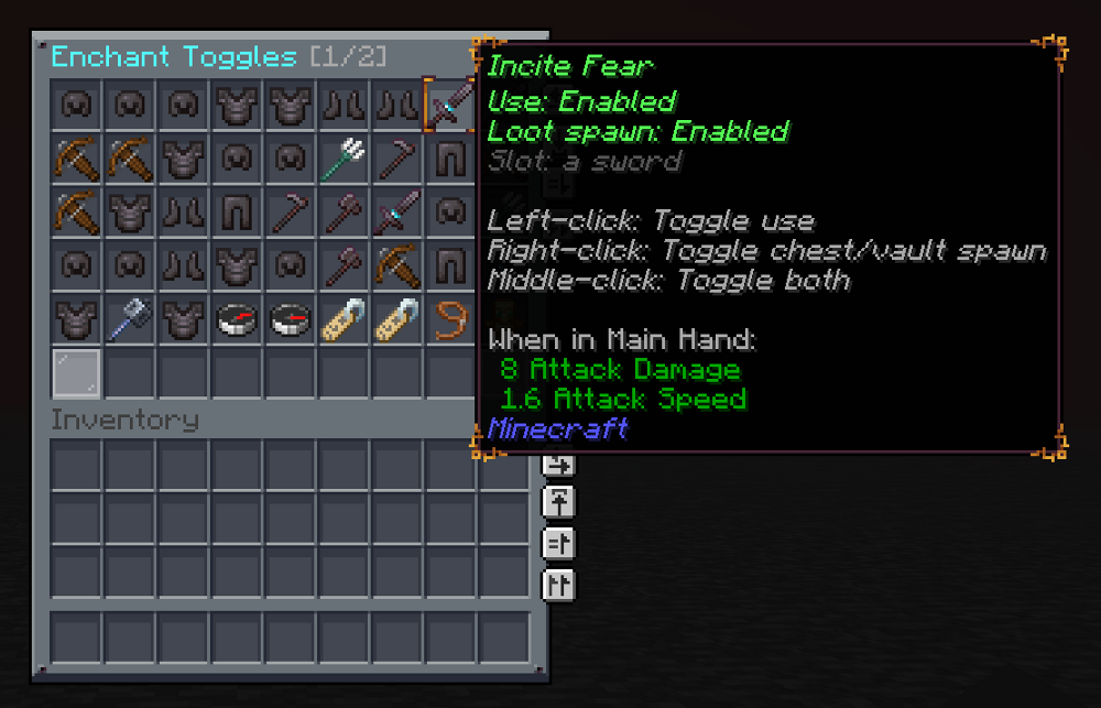 /fe togglesGUI for per-enchant enable/disable controls (usage and chest/vault spawning), with aliasessettingsandenchanttoggles.- Generate both enchant books and pre-enchanted gear items directly.