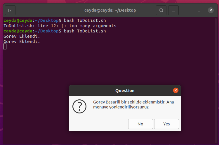GorevEkleFonksiyonu zenity --form yapısı ile oluşturulmuştur. Kullanıcıdan girişleri --add-combo=çoklu seçim sağlar --add-entry=metin giriş ekranı --add-calendar=Takvim giriş ekranı görevindedir. Alınan bu bilgileriaddr.txtisimli klasörde tutmaktadır. -
