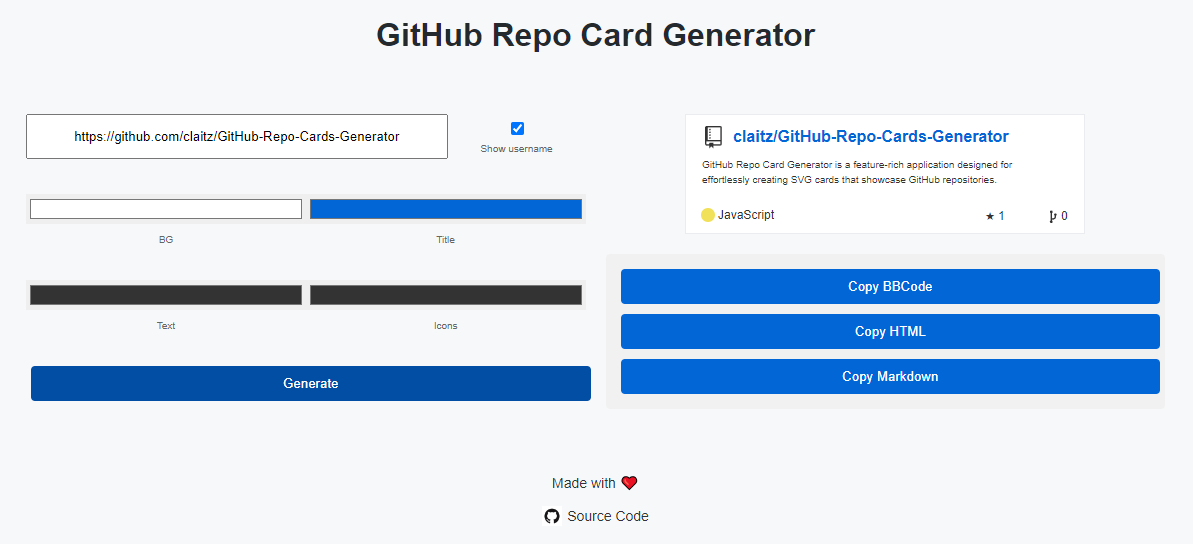 - Lightweight responsive UI with quick copy codes (BBCode, HTML, Markdown) for embedding the output SVG card