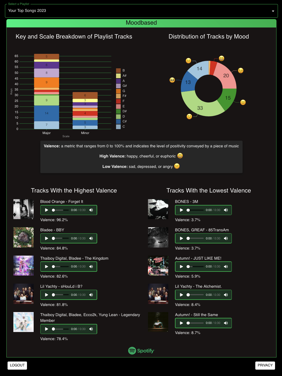 Moodbased is an application that utilizes the Spotify API to help users get a deeper understanding of the mood of their selected playlist. With its user-friendly interface, Moodbased provides three main features to its users: