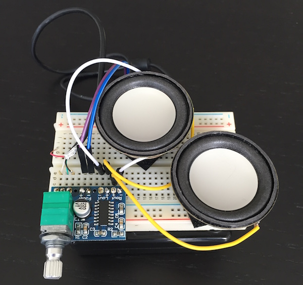 A Raspberry Pi 1 model A+ was used along with a 3W+3W 5V Amp and two 4 Ohm 3W speakers to build a small portable sleep aid.