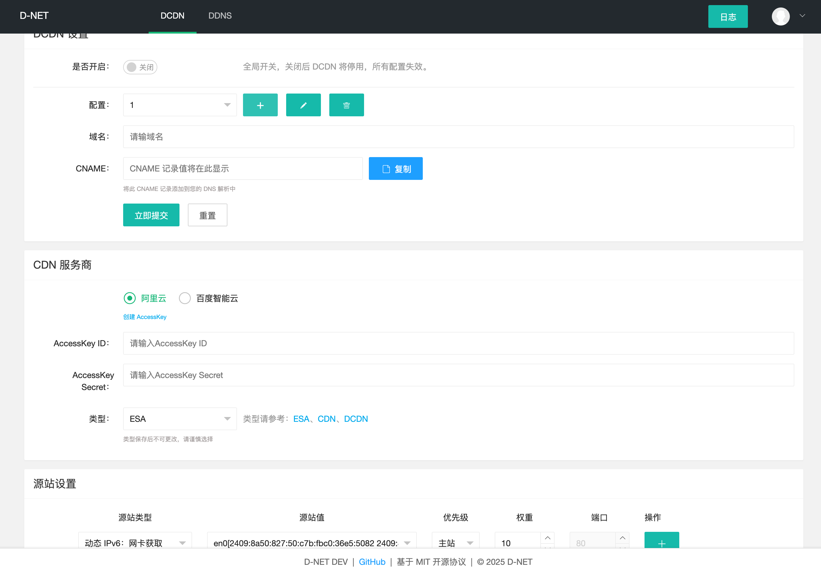 项目起源于一个实际需求:国内运营商分配的动态公网 IPv6 地址经常变化,无法直接支持 IPv4 访问。尝试使用 Cloudflare CDN 套壳后,发现国内访问速度慢且不稳定。在寻找国内 CDN 替代方案的过程中,D-NET 应运而生。
