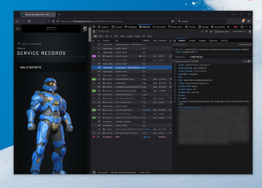 Some API calls are also requiring you include another header - 343-clearance. This token is obtained through a separate API call, but you can also grab it from the Halo Waypoint site. If you look for it in the network inspector, you will get the 343-clearance header as well.