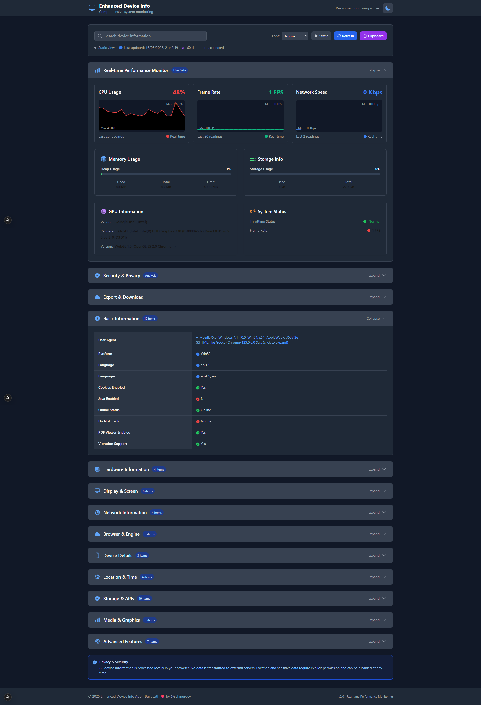 A comprehensive, real-time device information and performance monitoring application built with modern web technologies. Get detailed insights about your device, monitor system performance, and export data securely.