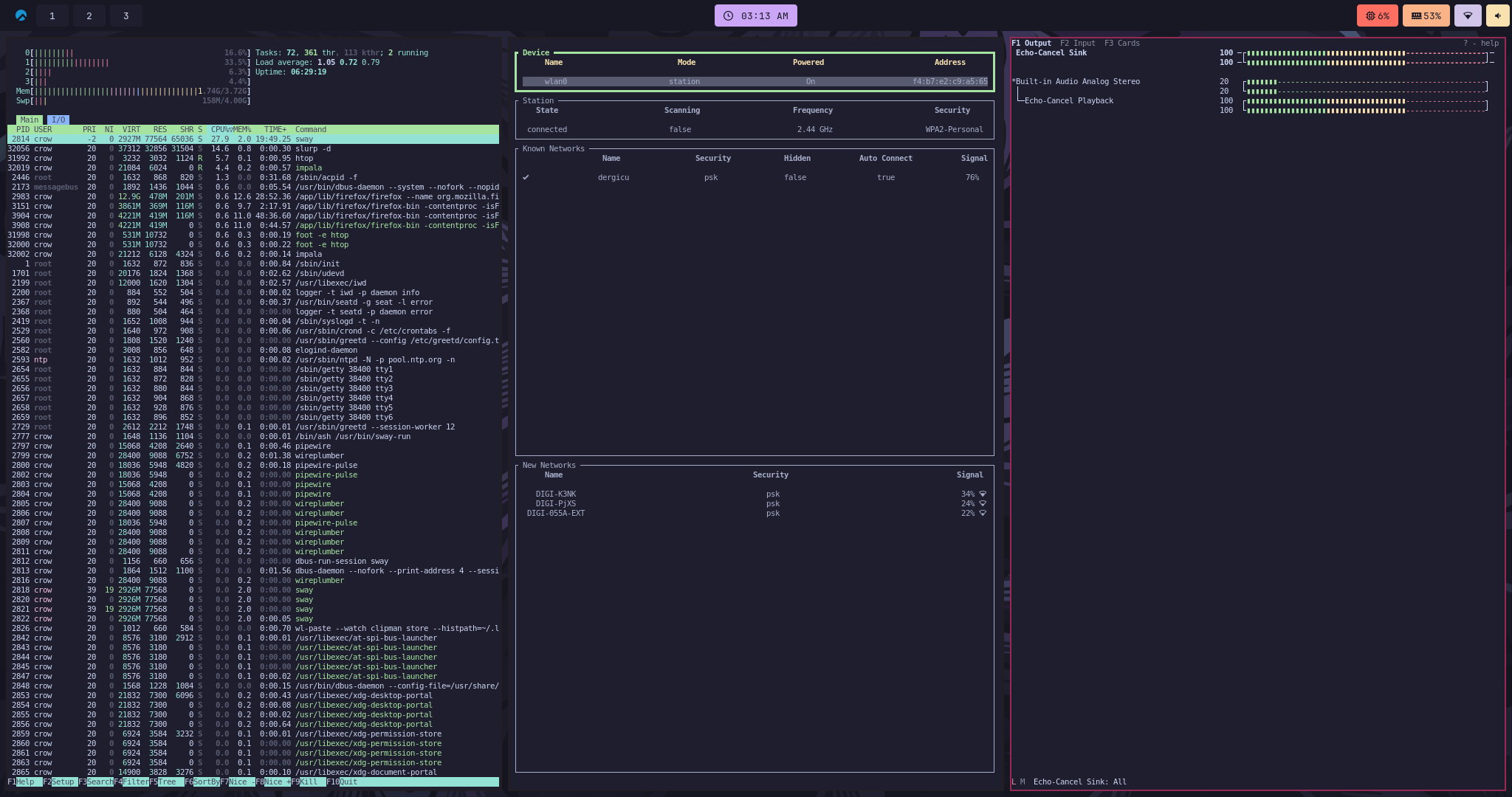 - sway (as a tiling window manager and wireless headphone input redirecter)