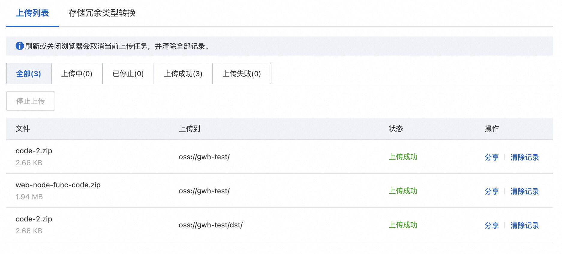 部署完成后,在oss对象存储中找到相应的OSS存储桶名,向该存储桶上传zip文件,如: