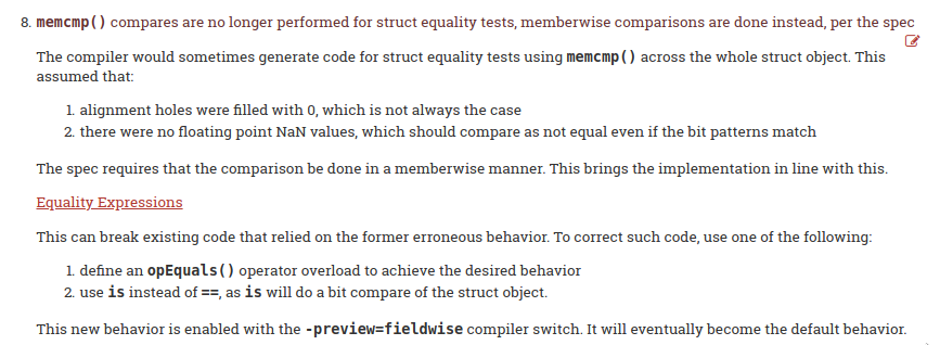 don't use memcmp() for struct equality, do memberwise comparisons per the spec#9331WalterBright merged 1 commit intodlang:masterfrom