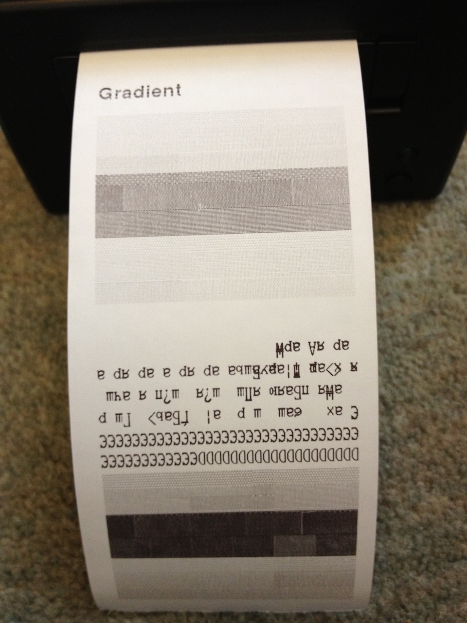 The first print (at the bottom) used a darkness of 150, and still demonstrated the error. The second print (at the top) used a darkness of 50, and printed successfully.