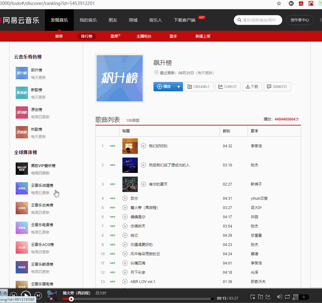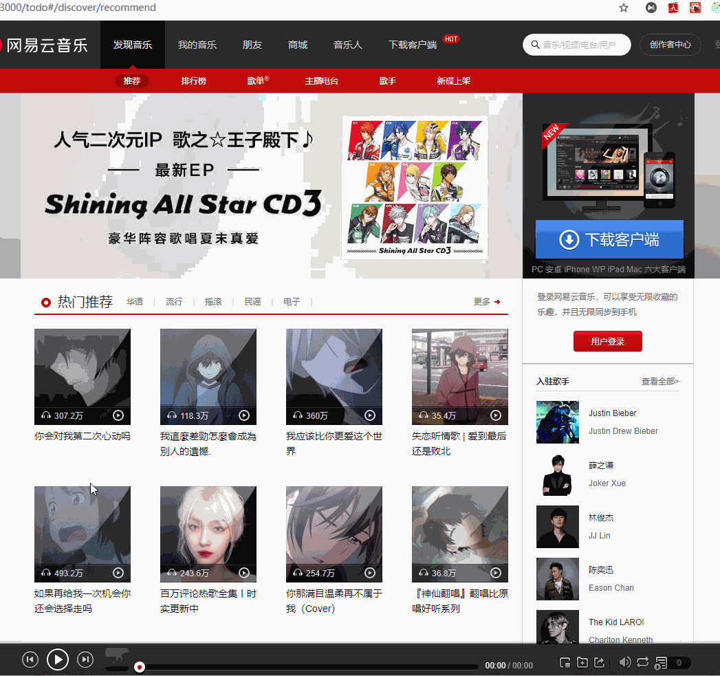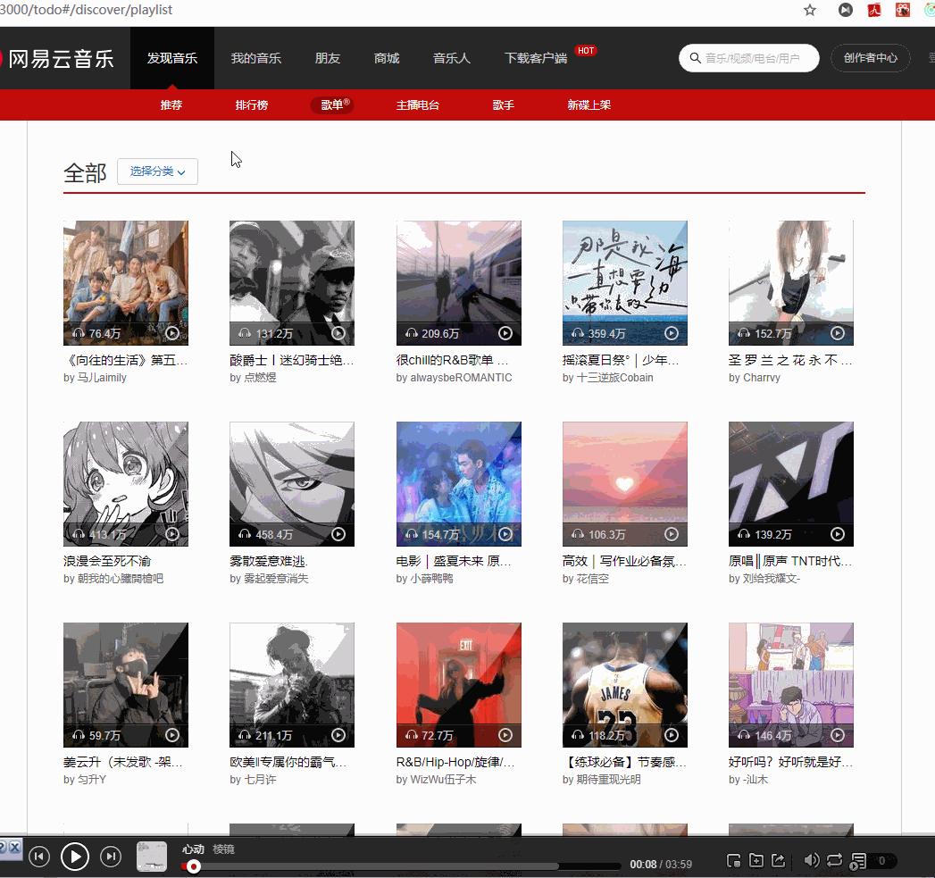 - 很多可用歌曲由于服务器架在阿里云,播放网易云音乐api下的歌曲容易被403,通常多播放几次即可(本地测试时这个错误不会发生)