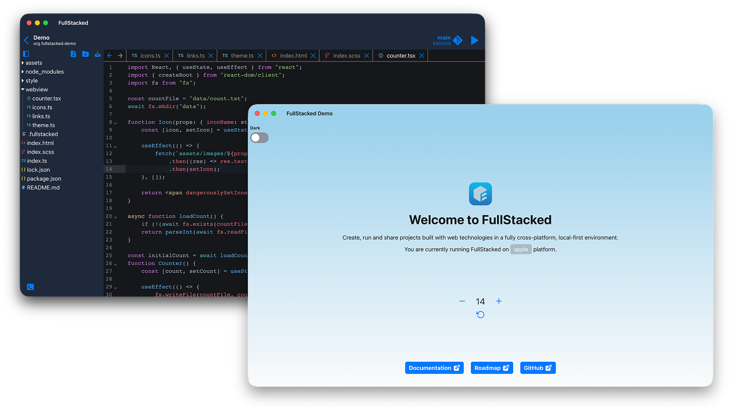 Create, run and share projects built with web technologies in a fully cross-platform, local-first environment.