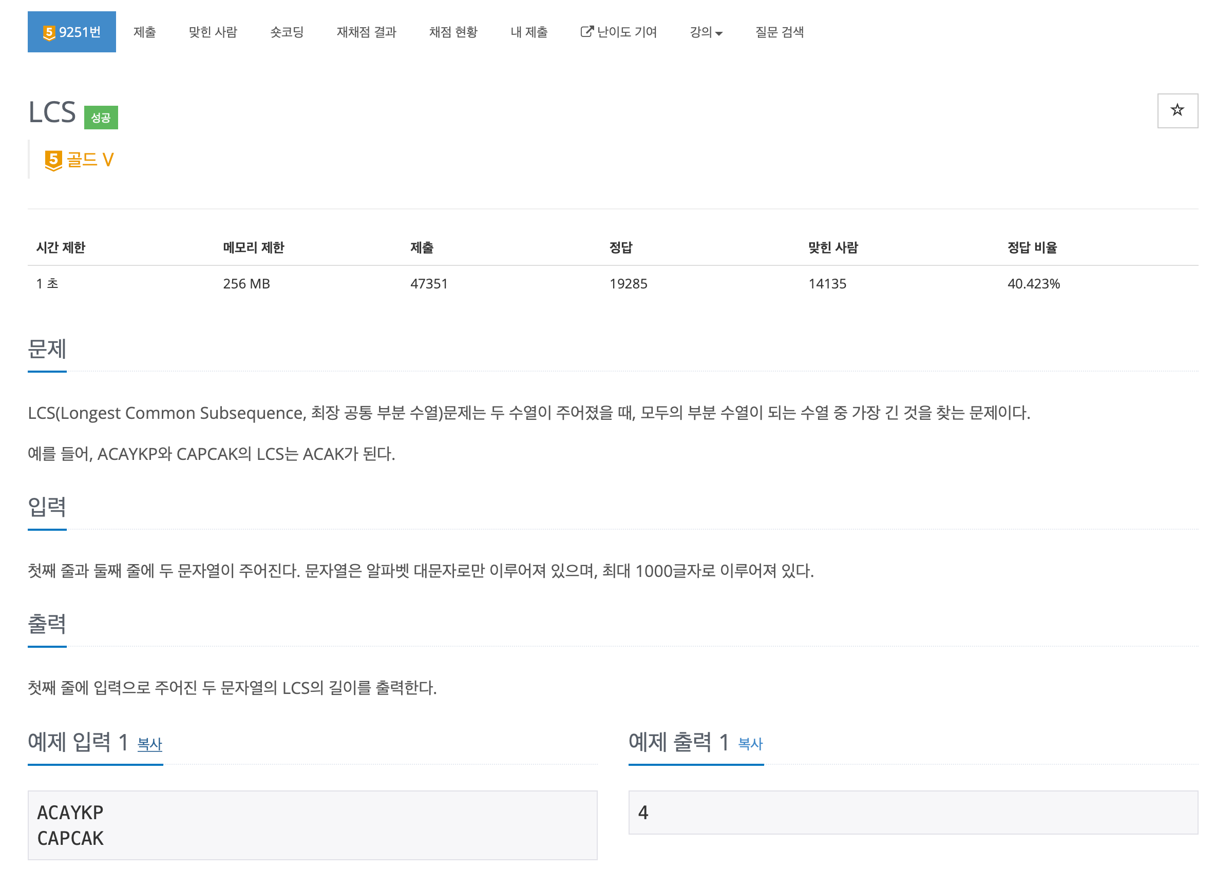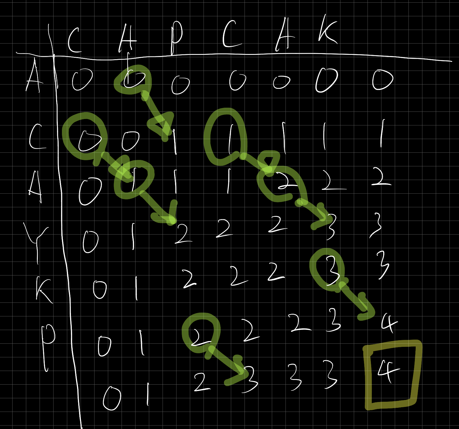 이를 반복하면 가장 오른쪽 최하단에 있는 숫자가 두개의 리스트에서 만들어 질 수 있는 가장 긴 LCS의 값이 나온다.