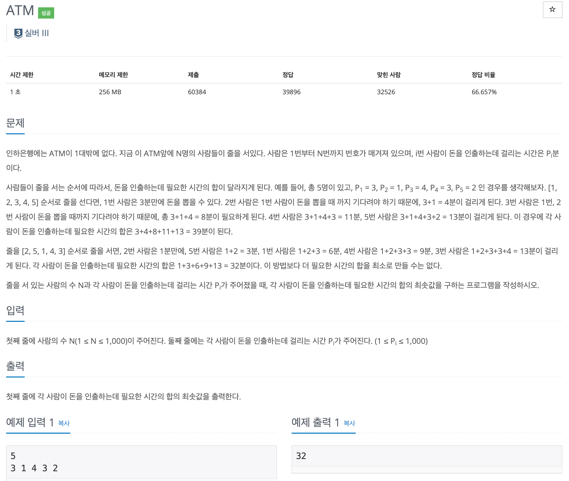 따라서 오름차순 정렬로 정렬해주고 누적해서 더해주면 정답이다.