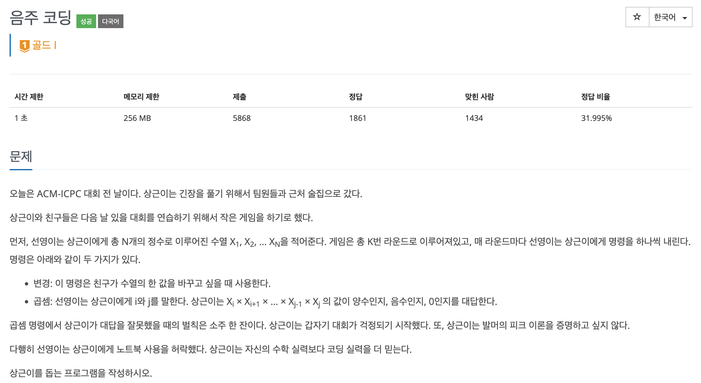 [백준 5676] 음주코딩 #165