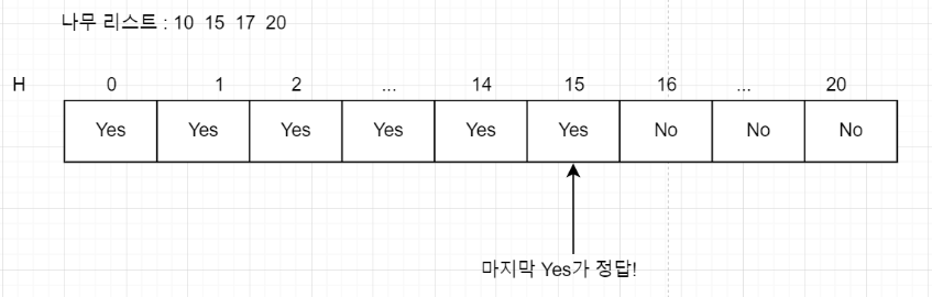 나무 리스트를 정렬해준 후 이분 탐색으로 H마다 Yes or No를 물어봐서 마지막 Yes인 H의 높이를 찾아낸다.