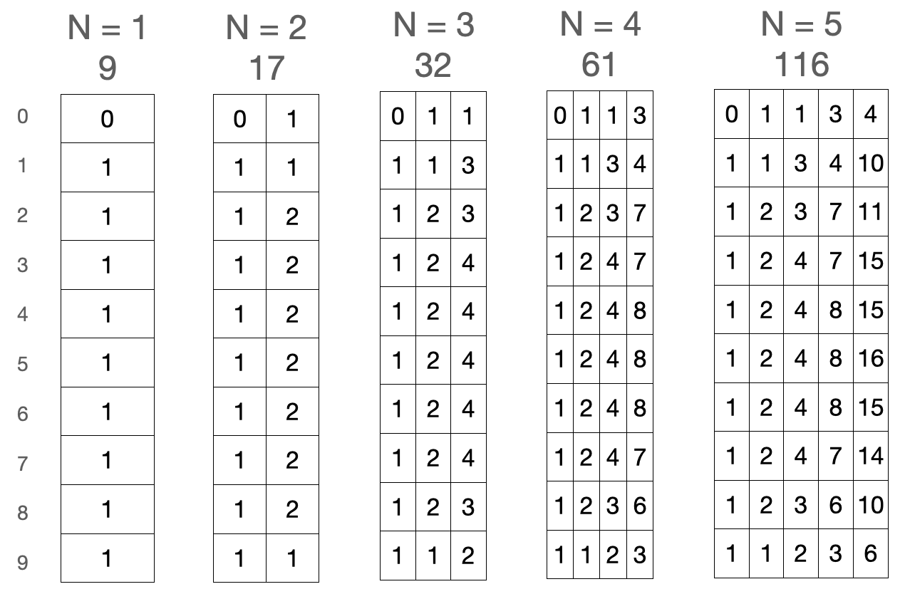 그래서 다음 계단수가 0일때의 개수는 현재 계단수의 1값을, 다음 계단수가 9일때에는 현재 계단수의 8값을 넣었고,