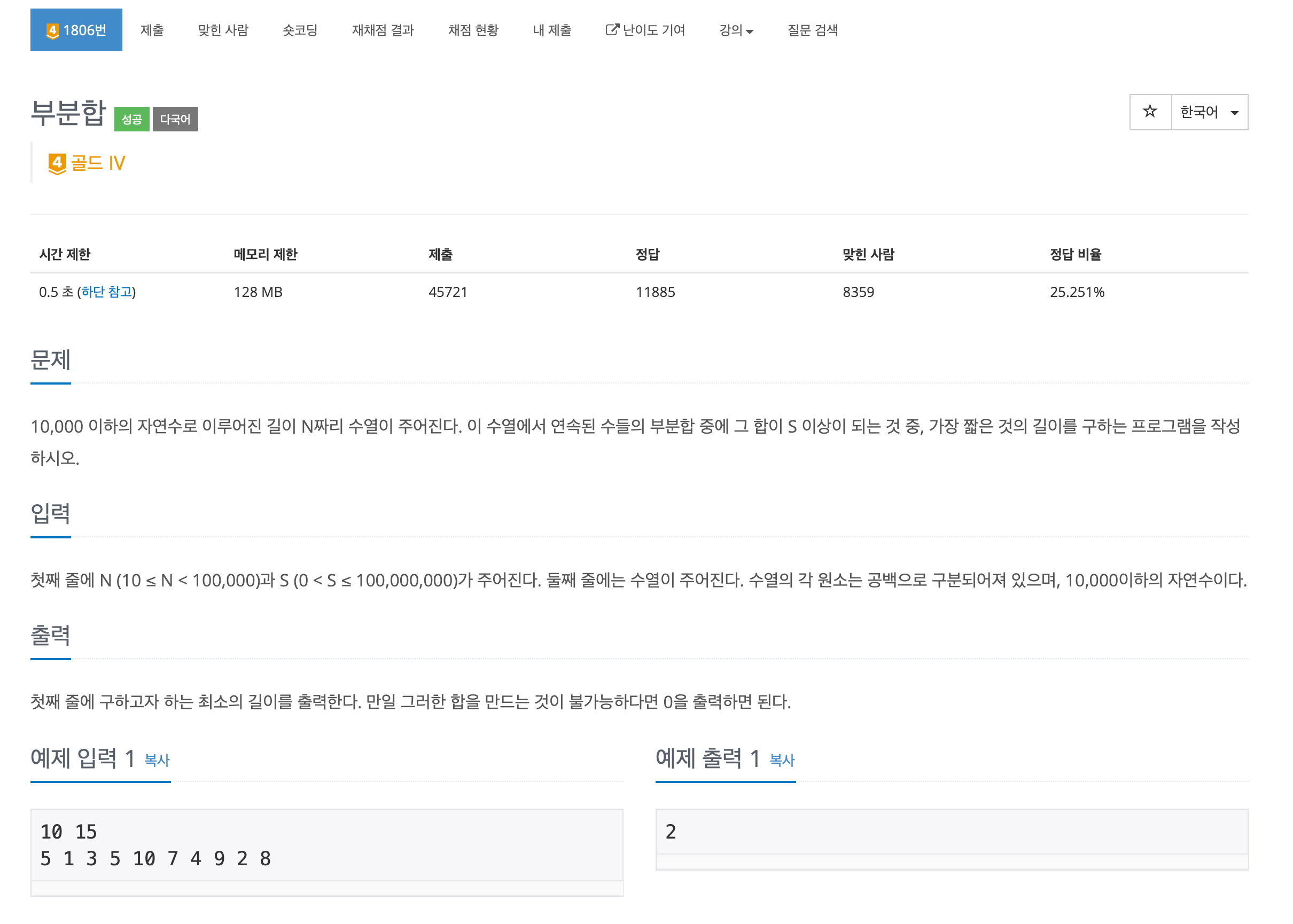 이게 최대한 짧은 것을 찾는 문제라서 s의 위치가 증가할수록 값이 감소하고 e가 증가할수록 ans값이 증가한다는 것을 알고 포인터 위치가 0에서 출발해야 한다는 사실만 알면 쉽게 구할 수 있었다.