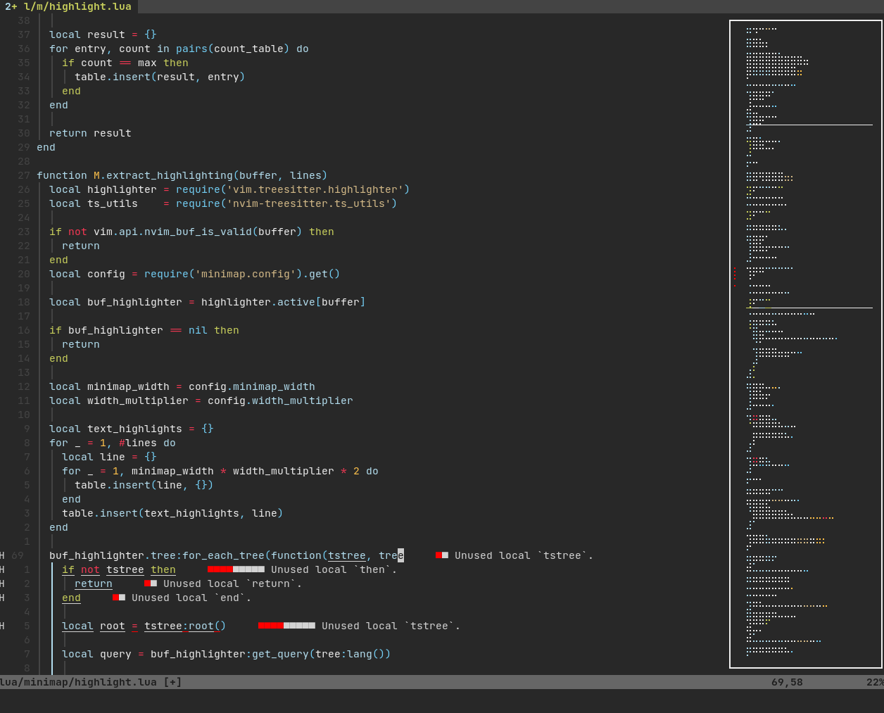 In this floating window you can see the text rendered out using braille characters. Unless disabled, it will also try to get the treesitter highlights from the active buffer and apply them to the minimap1. If the builtin LSP reports an error or a warning, it will also appear as a small red or yellow dot next to the line the issue is in. The current viewport is shown as 2 white lines around the block of code being observed.